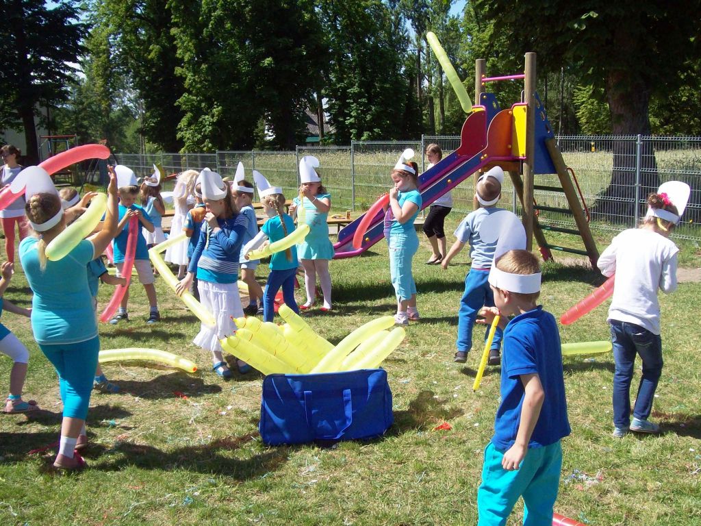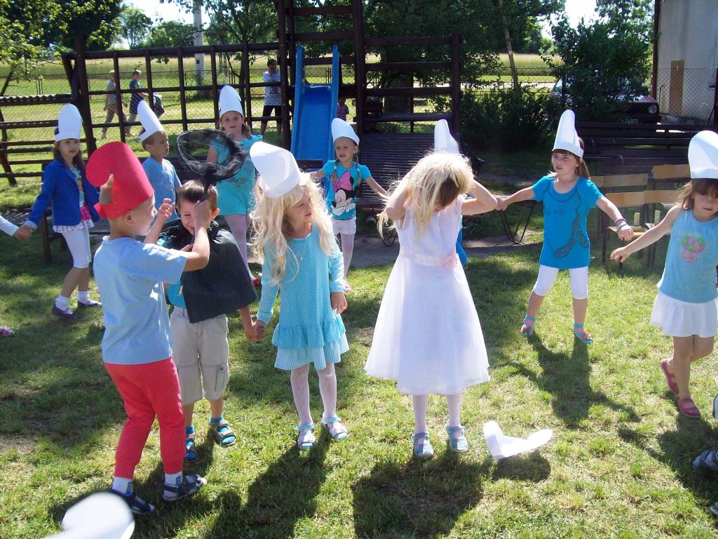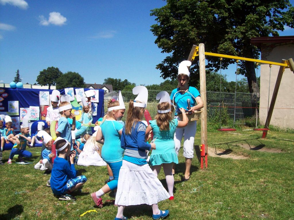 Ubrane w niebieskie bluzeczki i białe spodenki, w smerfnych czapeczkach zatańczyły do piosenki „A one są, a one są wszędzie”. Po pojawieniu się „Wioski Smerfów” przedszkolaki wzięły udział w konkursie plastycznym „Mój ulubiony Smerf”. Gdy wszyscy poczuli się smerfami, za sprawą zaklęć do wioski kolejno dołączali: „Papa Smerf”, „Smerfetka”, „Gargamel”, „Klakier”. Radości było, że ho, ho!!! Trzymając biało – niebieskie piłki „Smerfy – dzieci” zatańczyły bardzo ładny układ taneczny do piosenki „Dzieci lubią Smerfy”. Po słodkim poczęstunku w masce zaczęła się zabawa. Smerfy przepięknie grały na trąbkach, puszczały wystrzałowe serpentyny oraz piszczące balony.