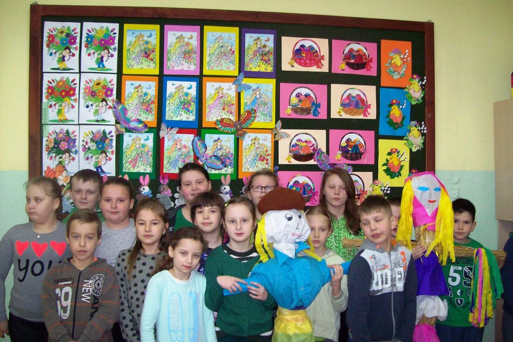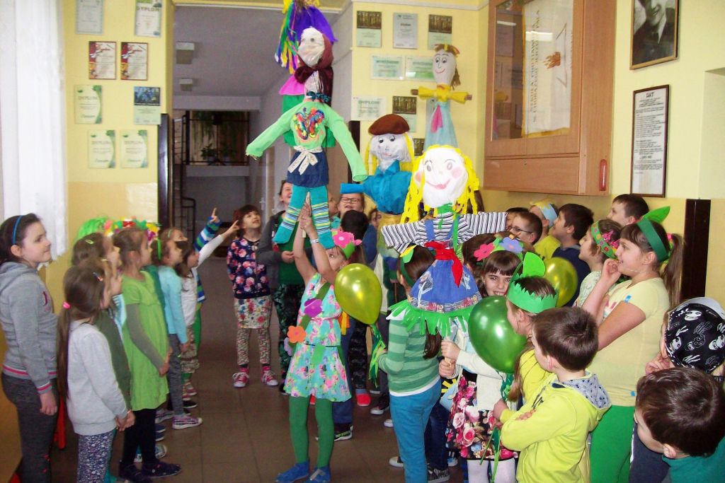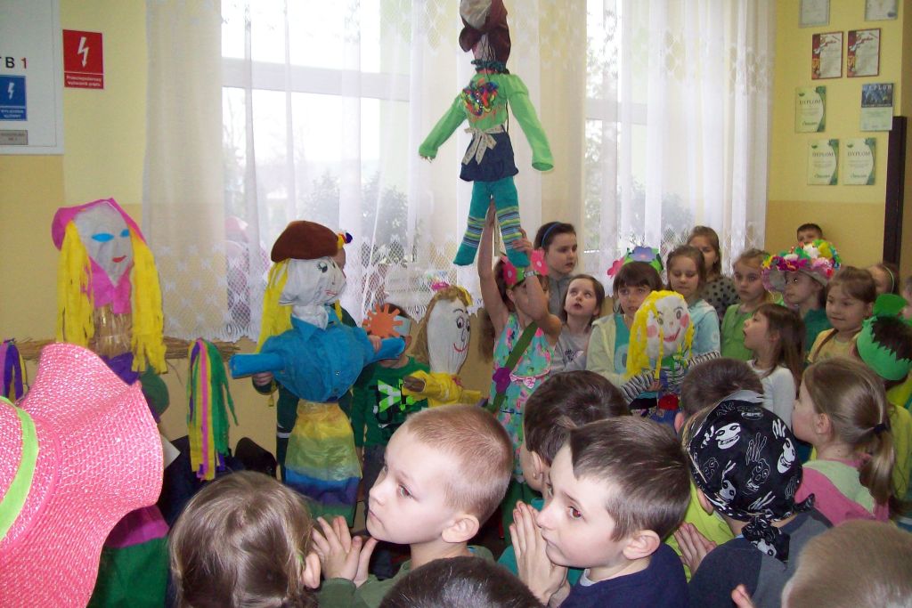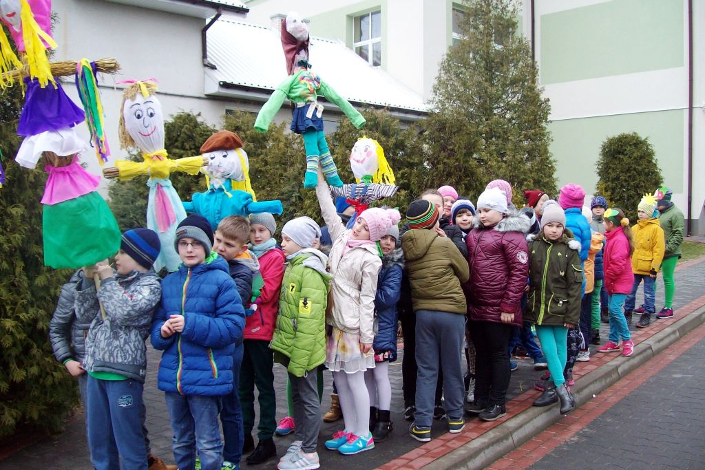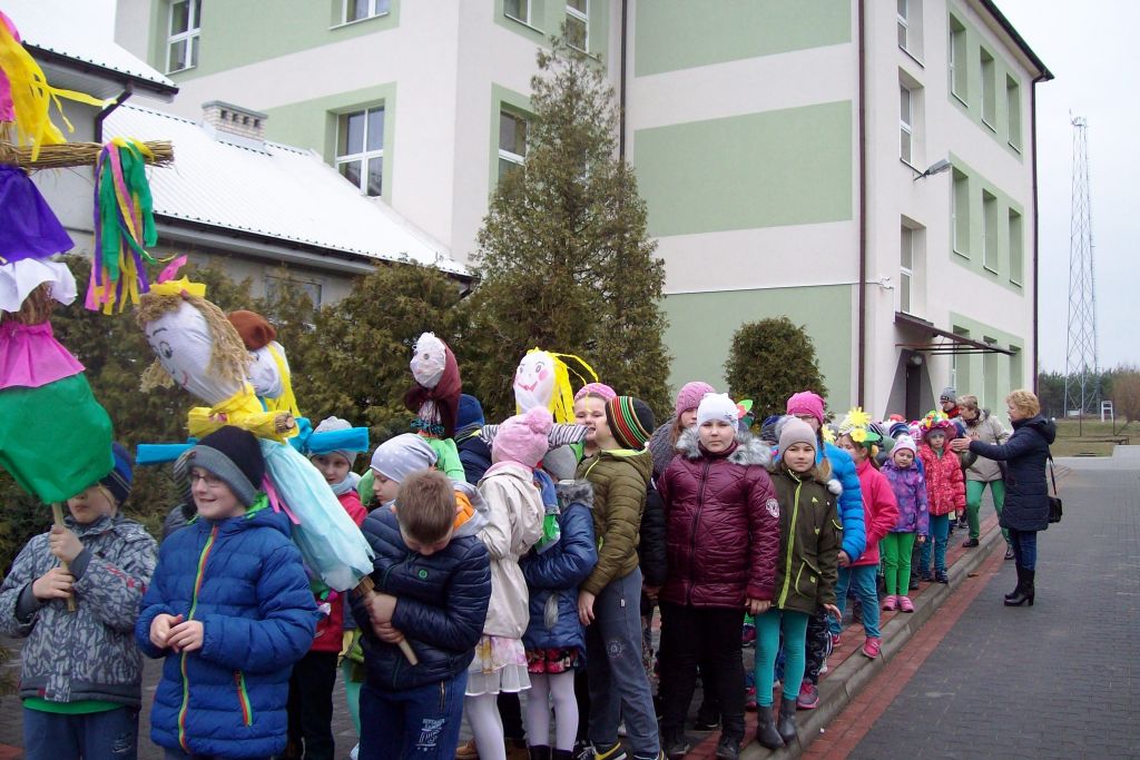 W barwnym korowodzie z MARZANNAMI wszyscy wyruszyli nad rzekę, gdzie „wypędzono zimę” poprzez spalenie marzanny. W drodze powrotnej wszyscy z wielkim zaangażowaniem szukali „zielonego gaika” symbolu wiosny, który został przyniesiony do szkoły. Wraz z nim wiosna zagościła w całej szkole.