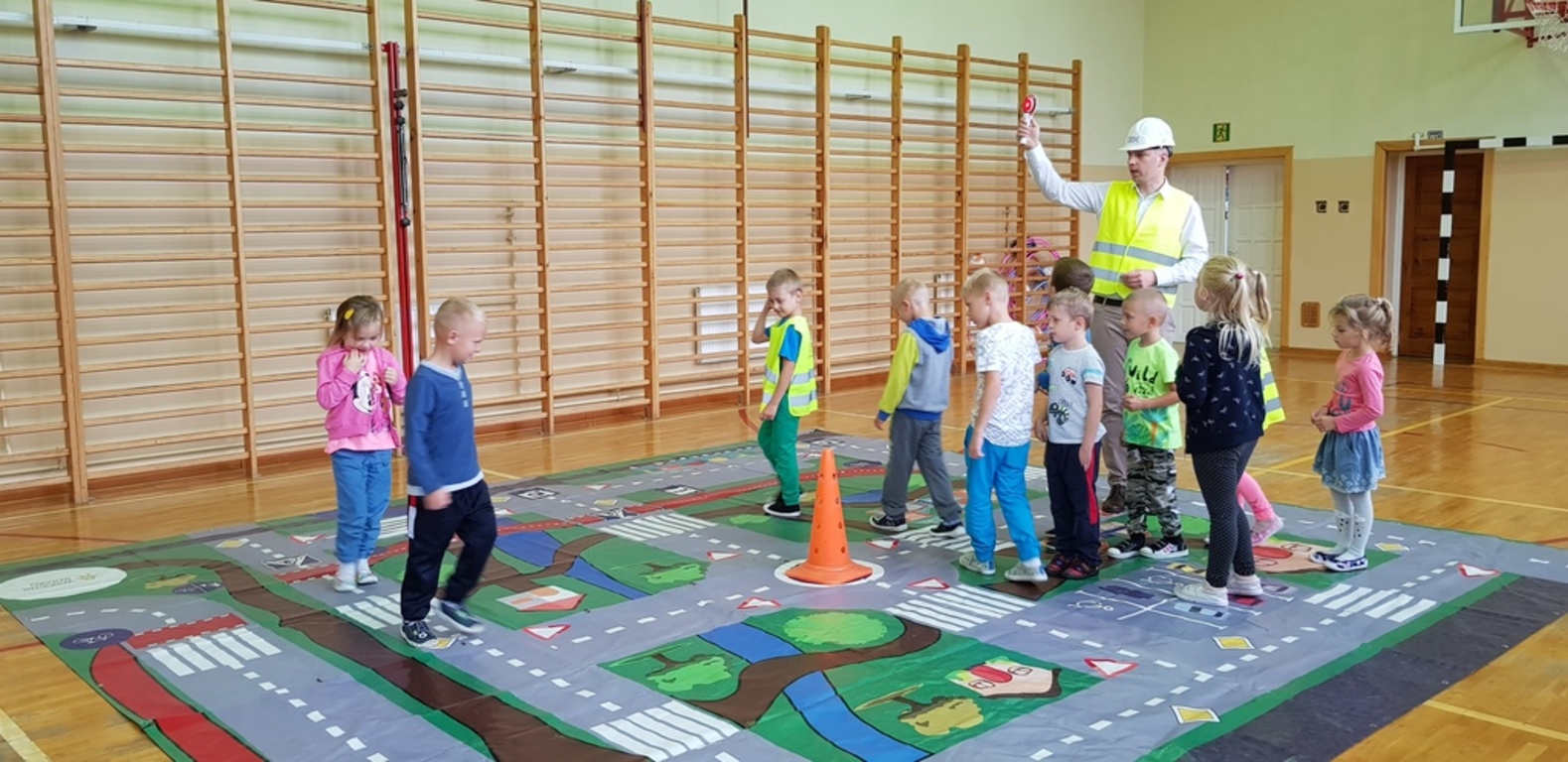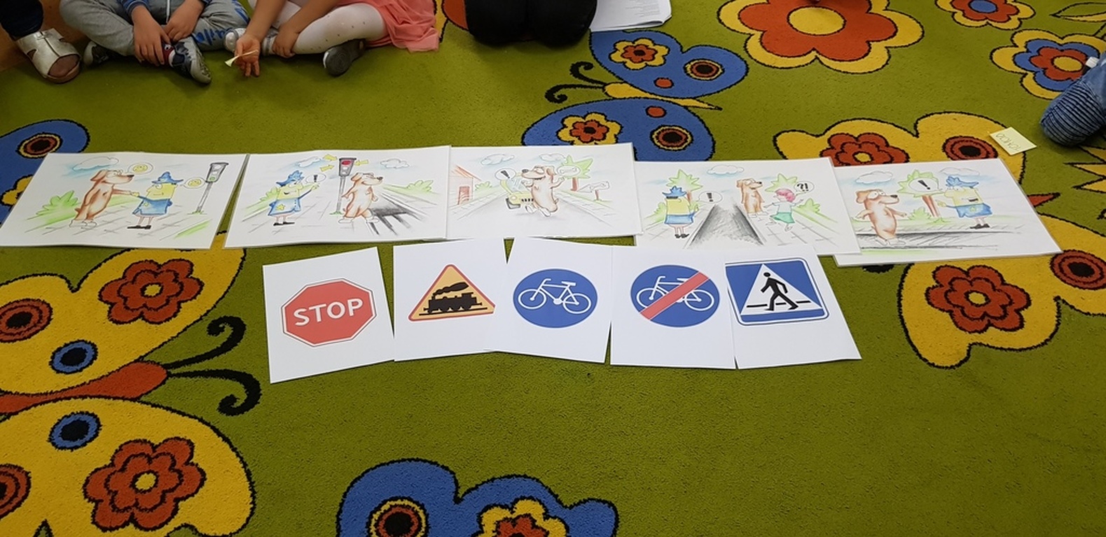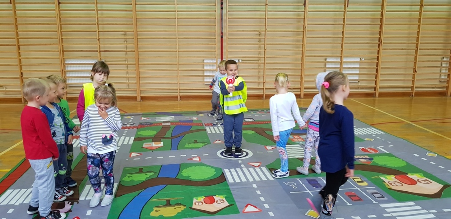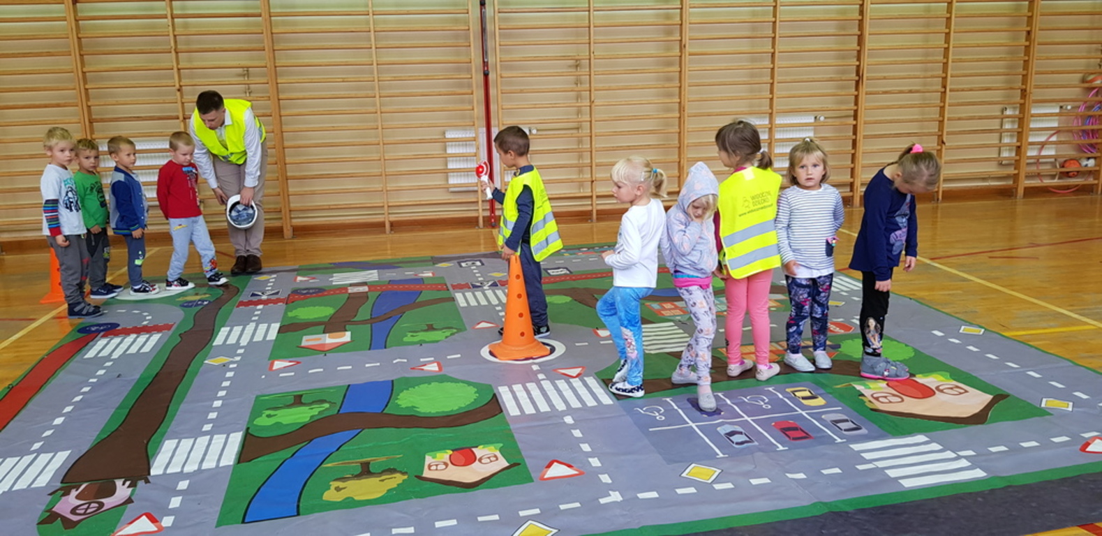 Dużym zainteresowaniem cieszyła się plansza „Miasteczko drogowe”, na której dzieci uczyły się poruszania po drodze, zarówno z perspektywy pieszego, jak i rowerzysty, przechodzenia przez przejście dla pieszych, poruszania się po chodniku ze ścieżką rowerową oraz reagowania na sygnalizację świetlną. W zabawach z wykorzystaniem planszy dzieci angażowały zmysły wzroku, słuchu i dotyku poprzez działanie na konkretach.