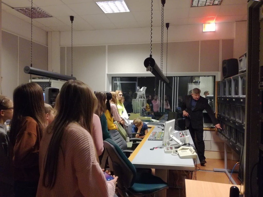 Uczniowie zwiedzili gmach TVP pod opieką przewodnika. Mieli okazję zobaczyć pracę na planie, podziwiać dekoracje, a nawet wejść do jednej z „reżyserek”.
