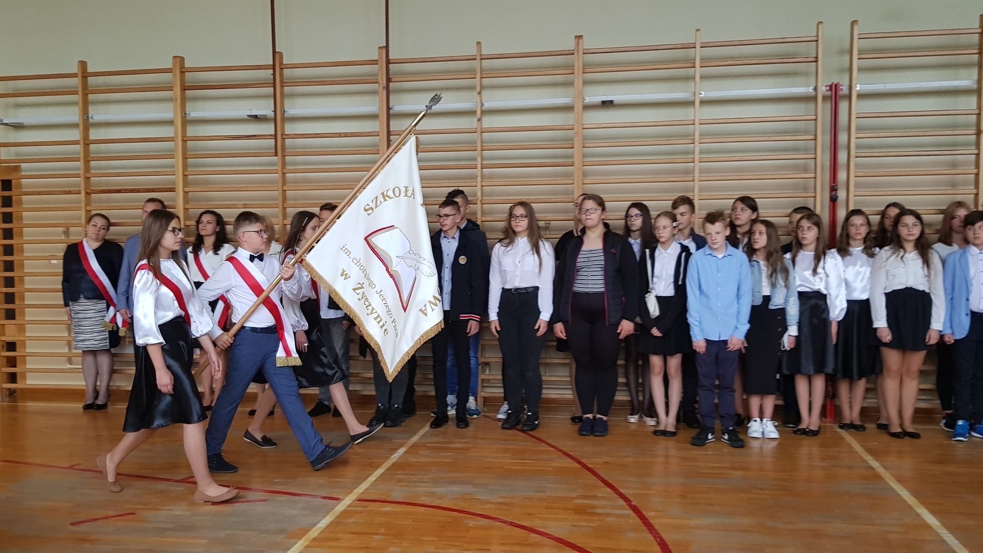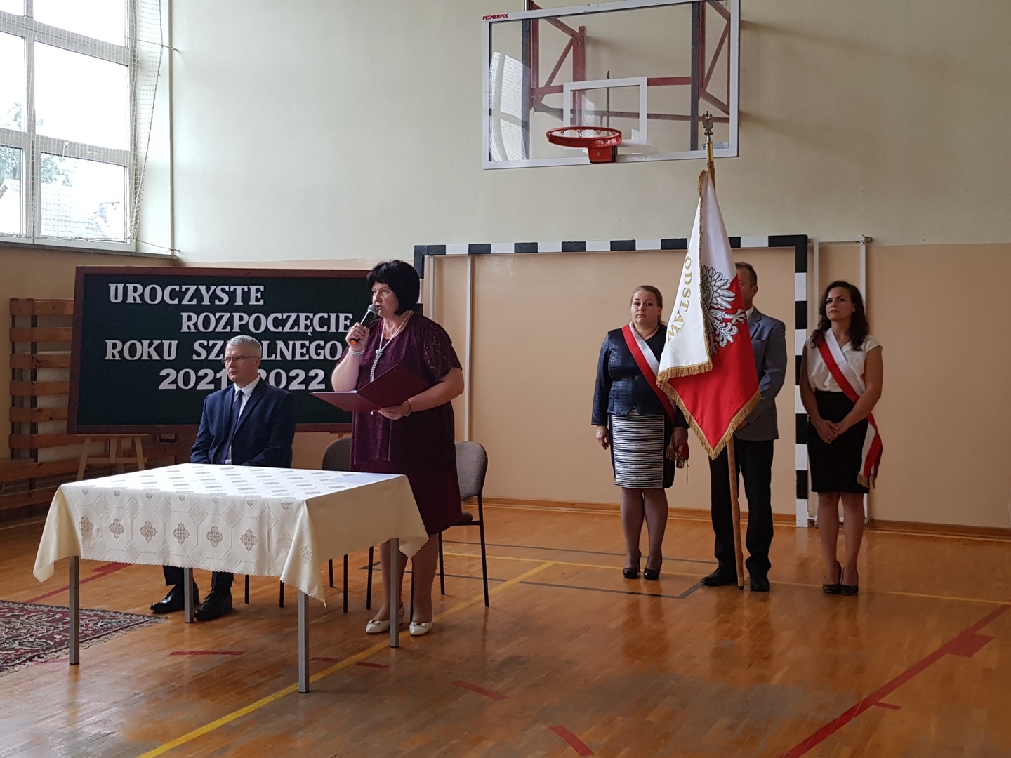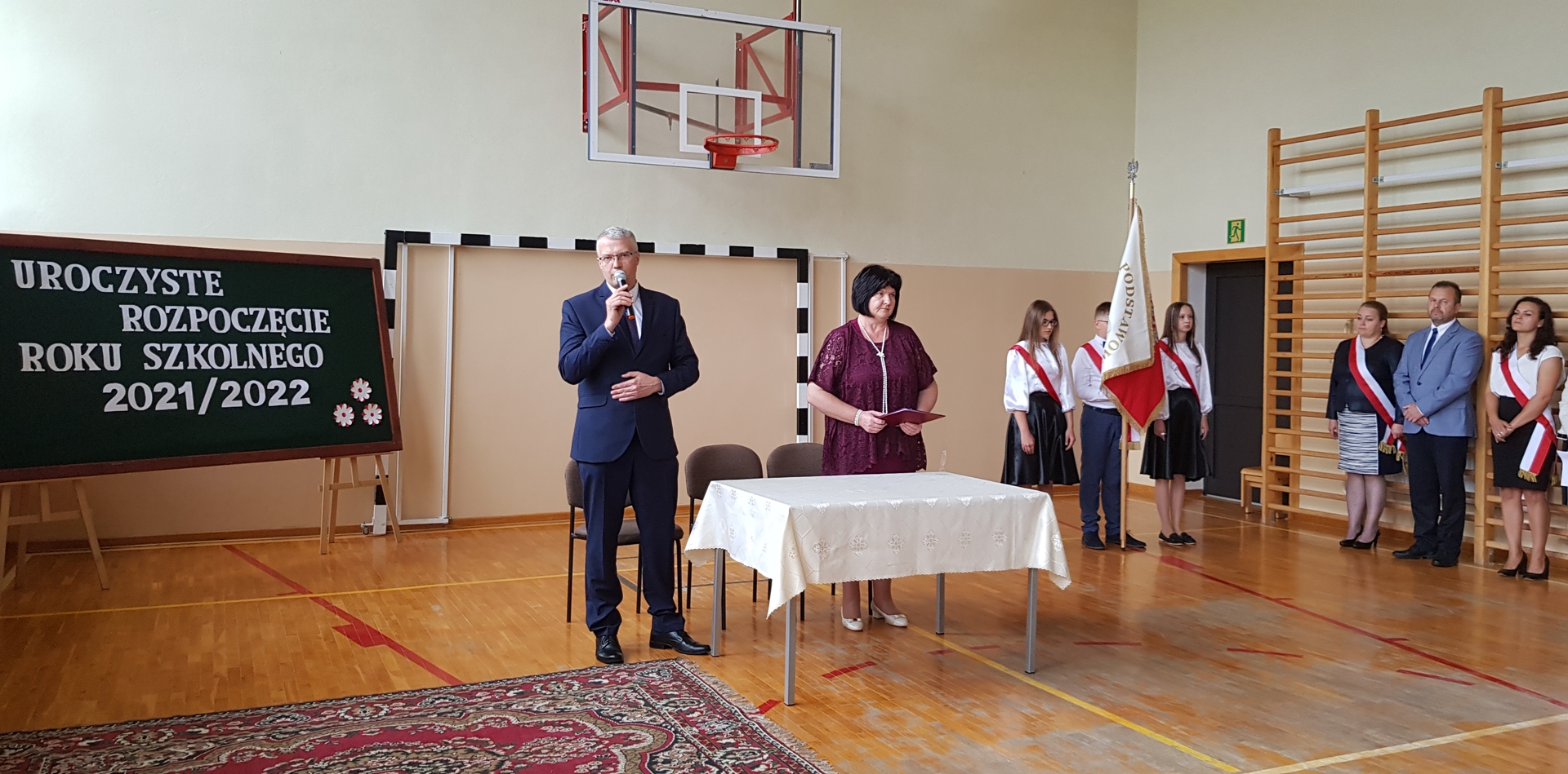 Po zakończeniu, wszyscy udali się na salę gimnastyczną szkoły, gdzie uroczyście wprowadzono nowy sztandar oraz odśpiewano hymn Polski. Nie zabrakło również okolicznościowego przemówienia Dyrektora szkoły oraz Przewodniczącego Rady Gminy, podczas którego wszyscy zostali bardzo ciepło przywitani w kolejnym roku edukacyjnym. Doniosłym momentem uroczystości było przekazanie sztandaru przez Radę Rodziców Dyrektorowi szkoły, a następnie pocztowi sztandarowemu uczniów. Na koniec, odbyły się pierwsze powakacyjne spotkania z wychowawcami.