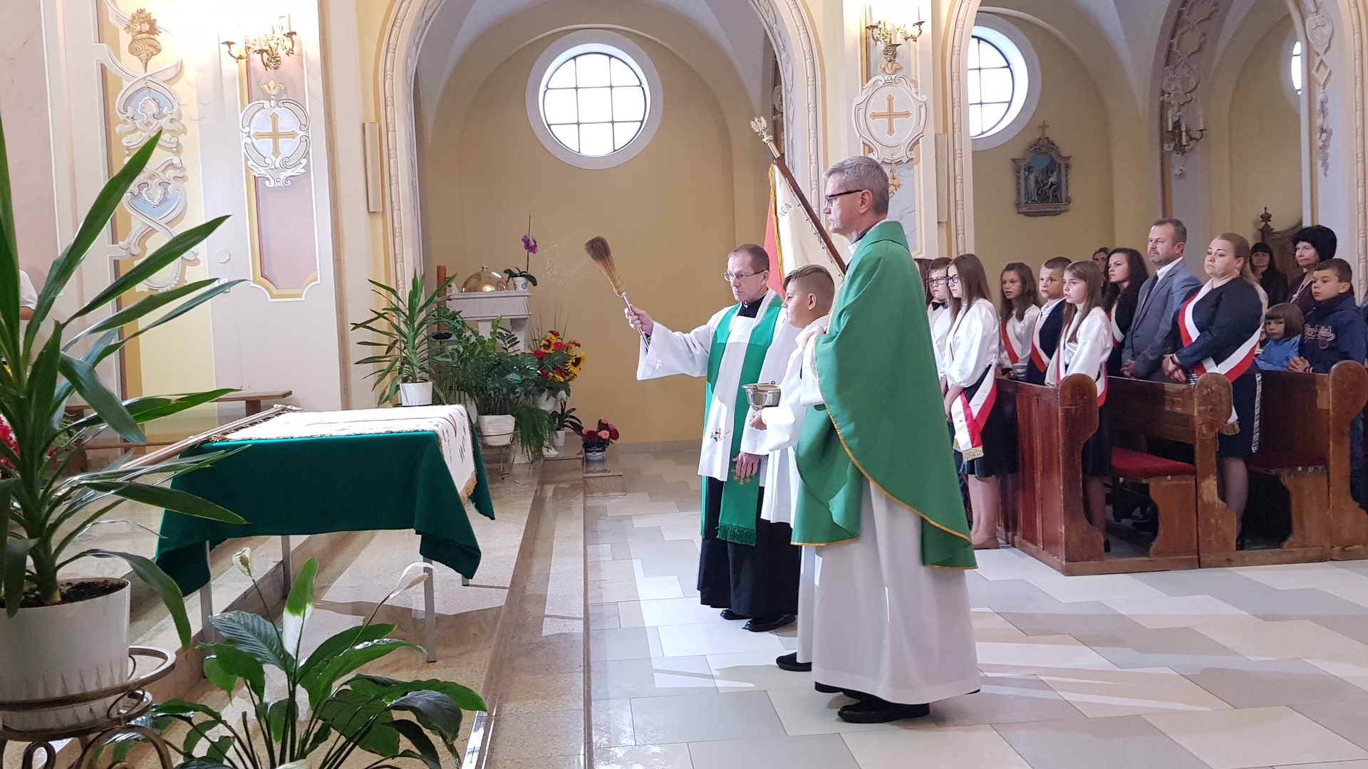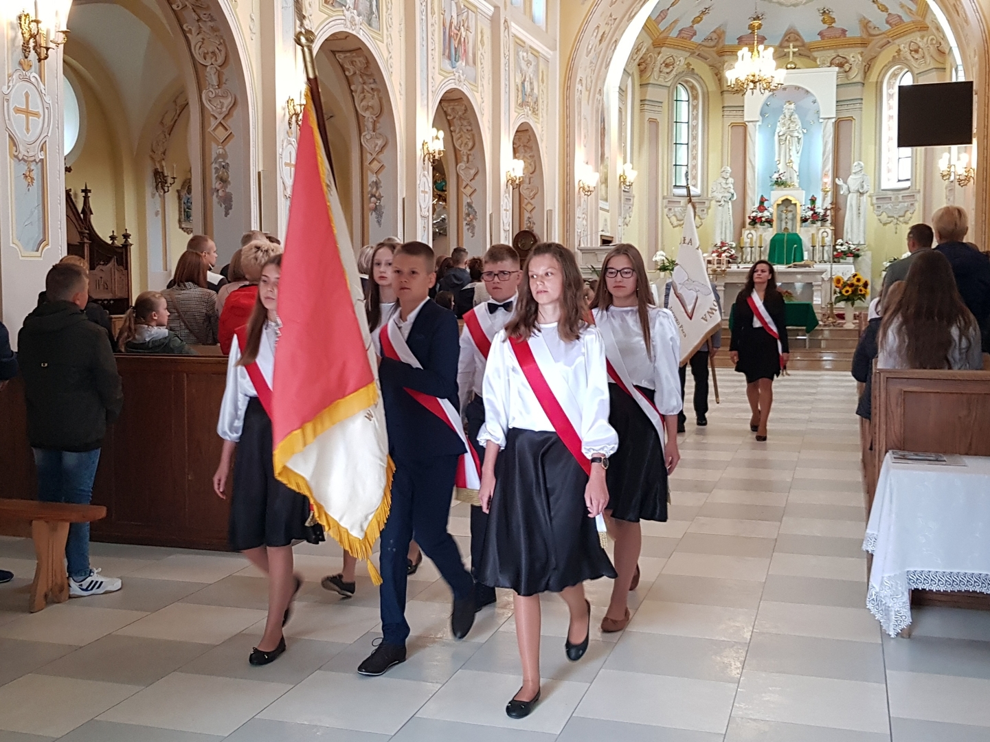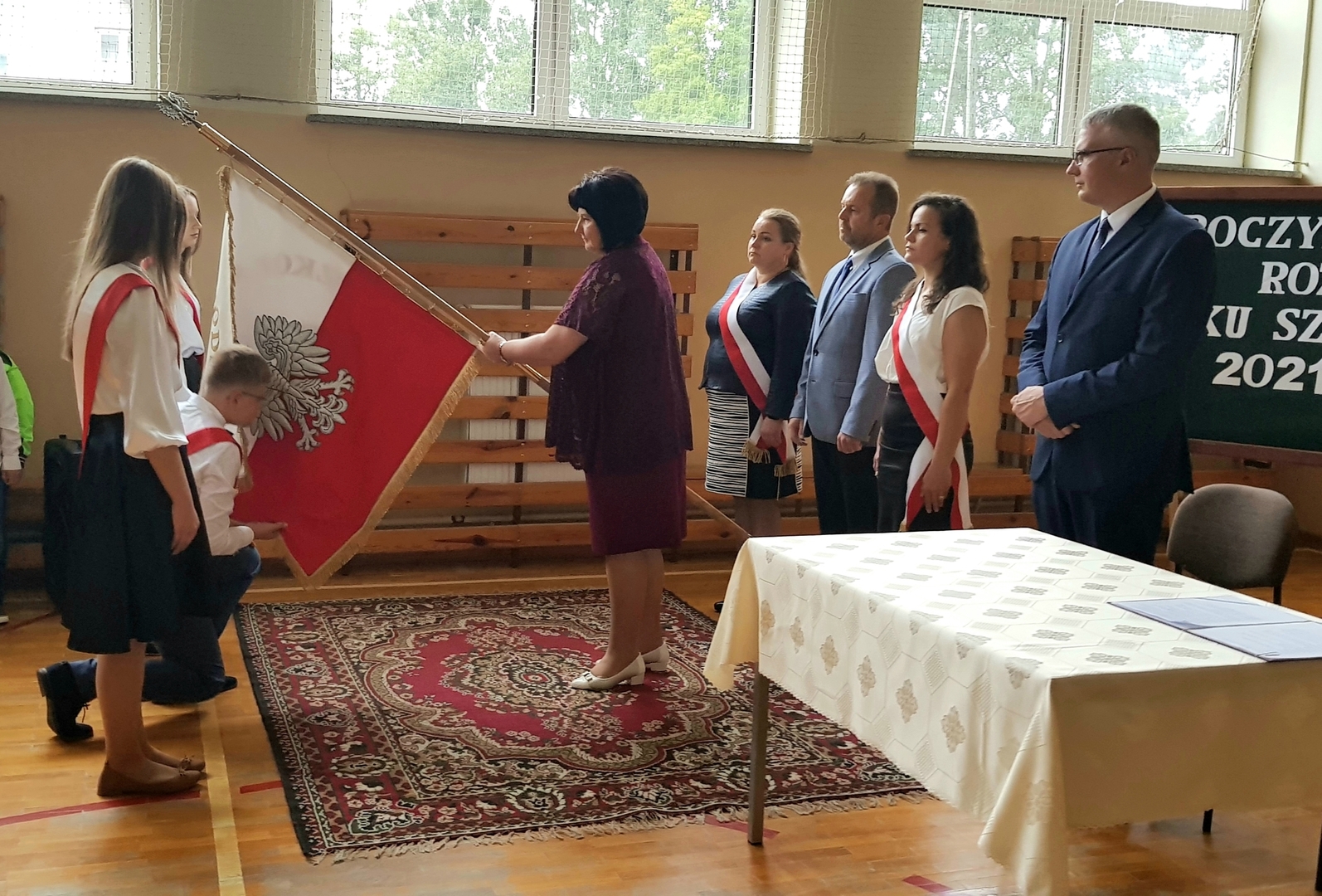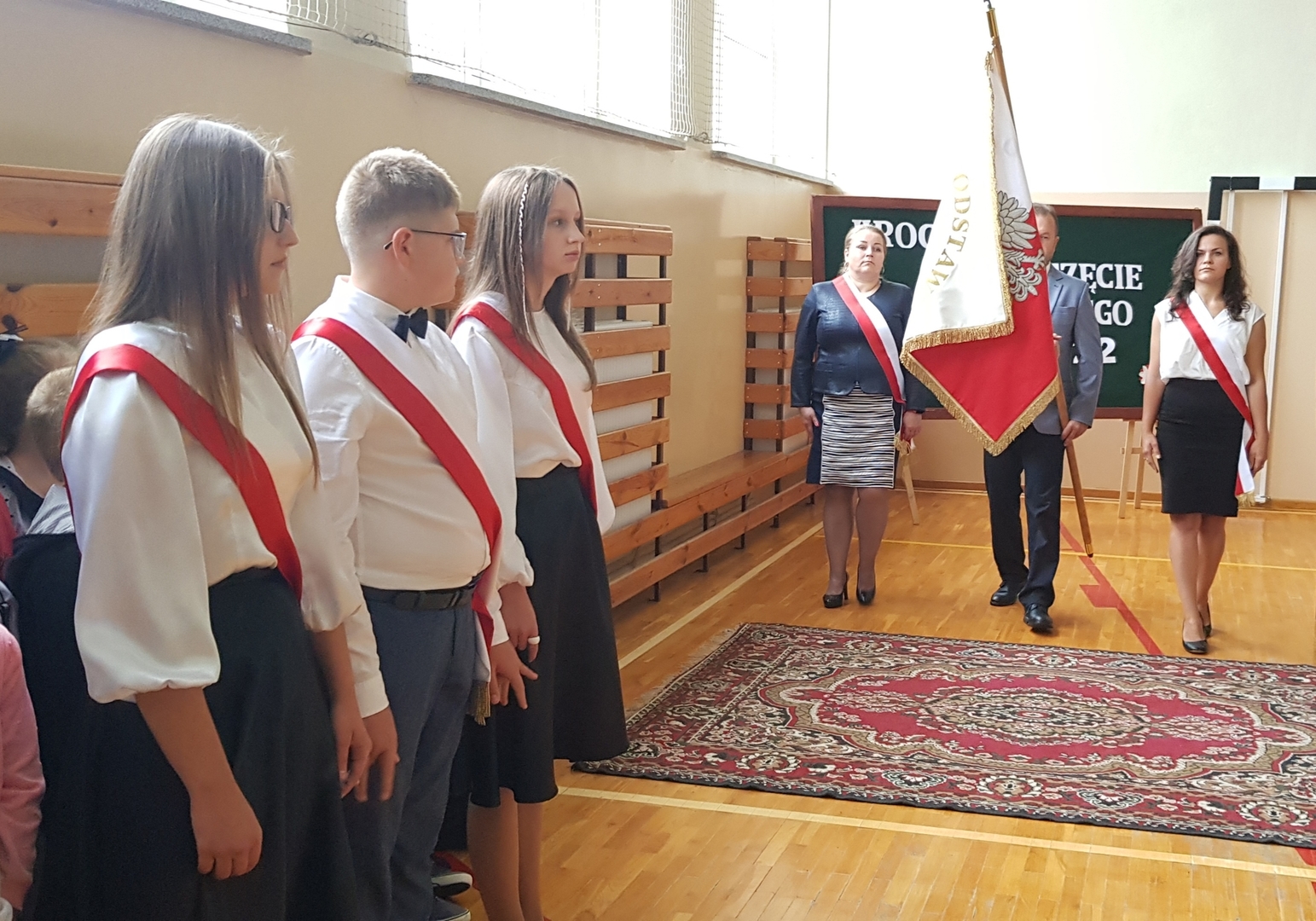 Po zakończeniu, wszyscy udali się na salę gimnastyczną szkoły, gdzie uroczyście wprowadzono nowy sztandar oraz odśpiewano hymn Polski. Nie zabrakło również okolicznościowego przemówienia Dyrektora szkoły oraz Przewodniczącego Rady Gminy, podczas którego wszyscy zostali bardzo ciepło przywitani w kolejnym roku edukacyjnym. Doniosłym momentem uroczystości było przekazanie sztandaru przez Radę Rodziców Dyrektorowi szkoły, a następnie pocztowi sztandarowemu uczniów. Na koniec, odbyły się pierwsze powakacyjne spotkania z wychowawcami.