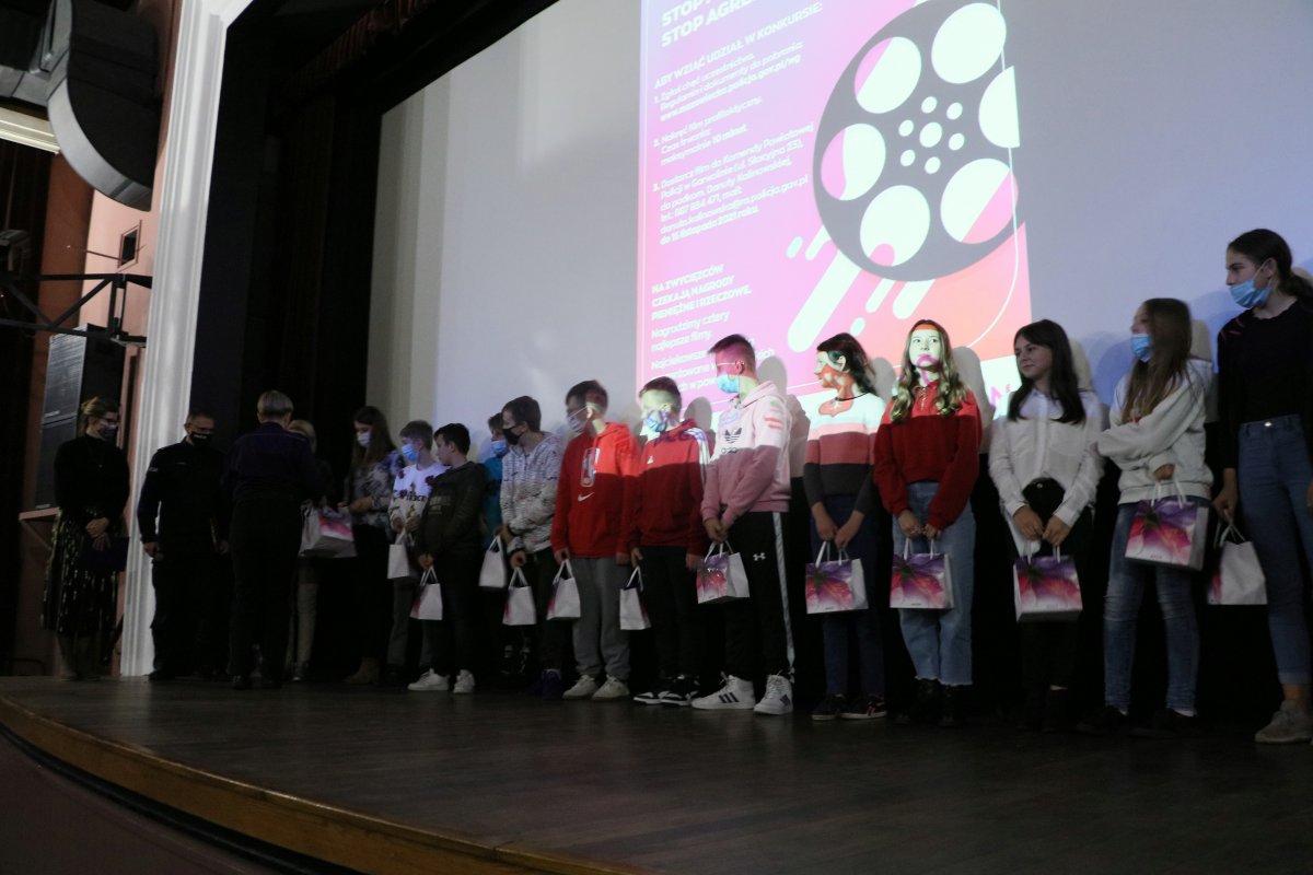 Zadaniem uczniów było przygotowanie filmu nawiązującego do hasła, przyświecającego całej inicjatywie „Stop przemocy rówieśniczej, stop agresji wobec innych". Podczas przedglądu filmów, w dniu 18 listopada br., odbyło się wspólne oglądanie przysłanych prac oraz wyłonienie przez jury zwycięzców konkursu na najlepsze nagranie.