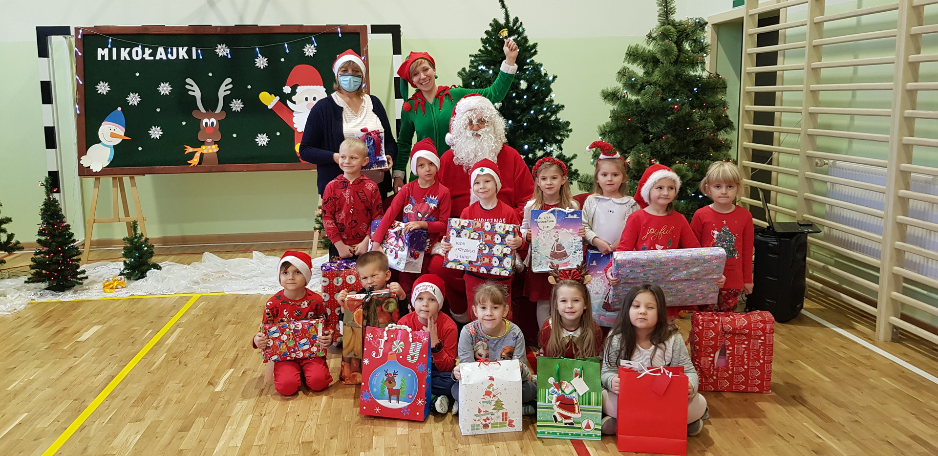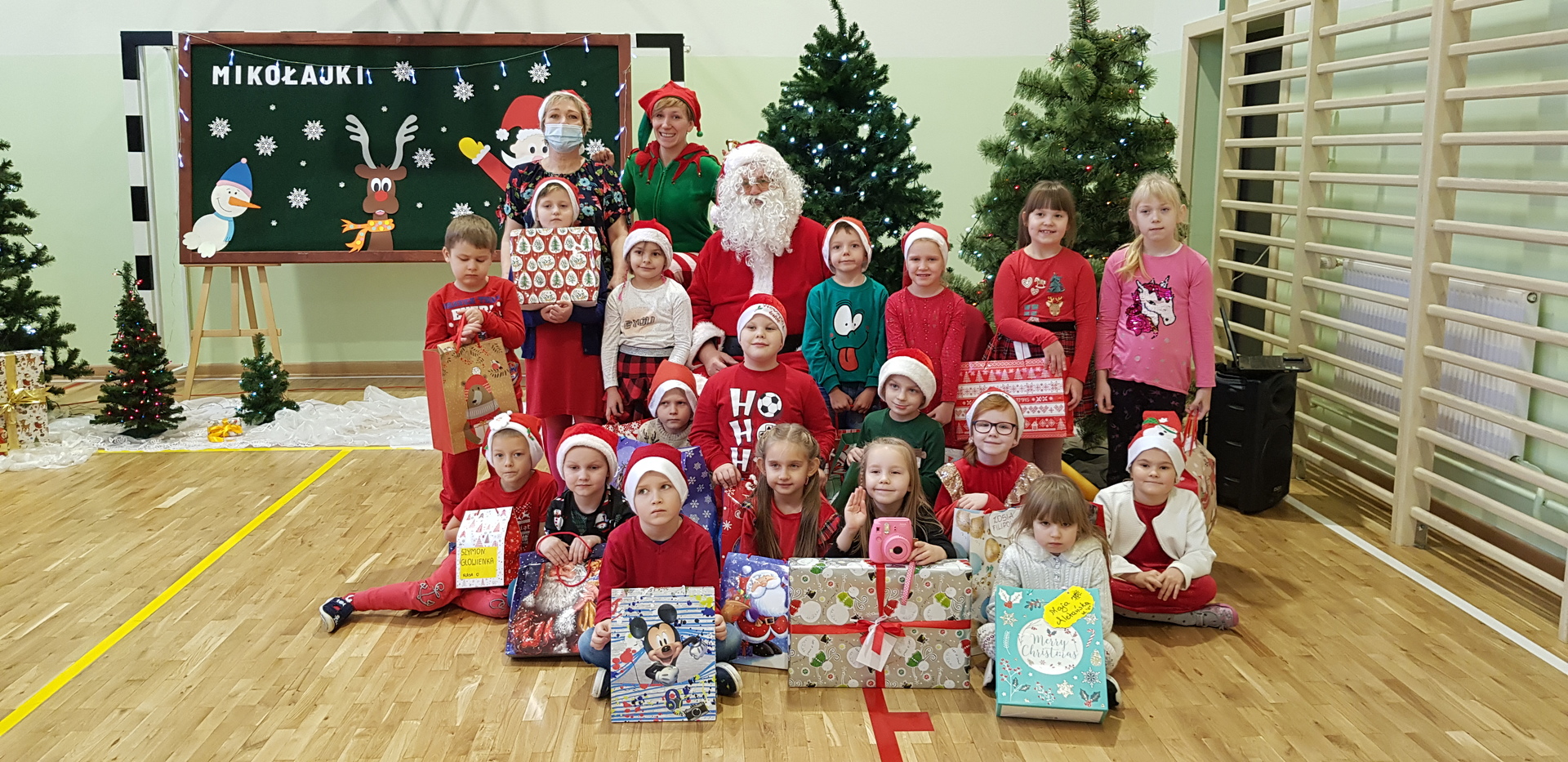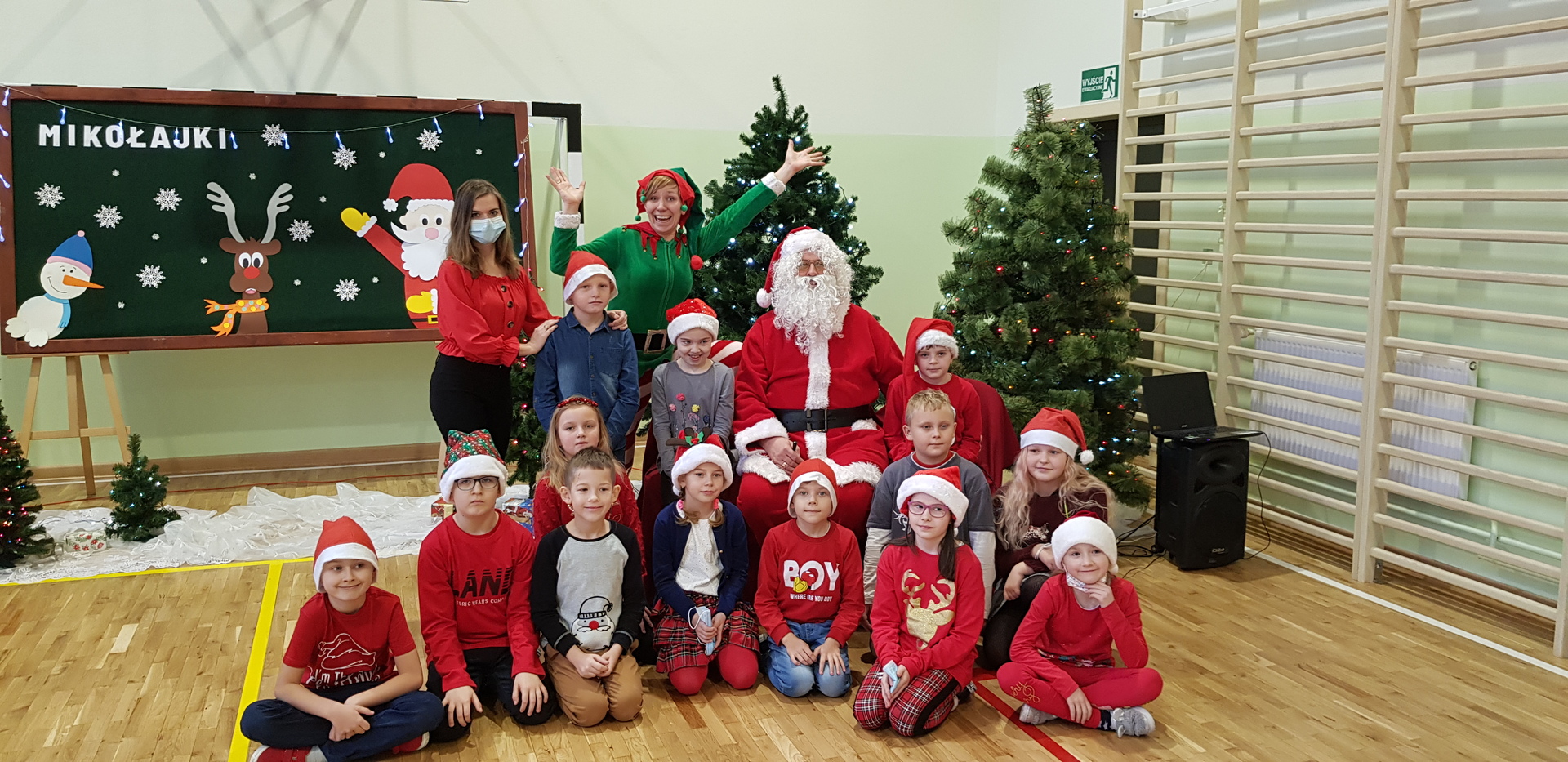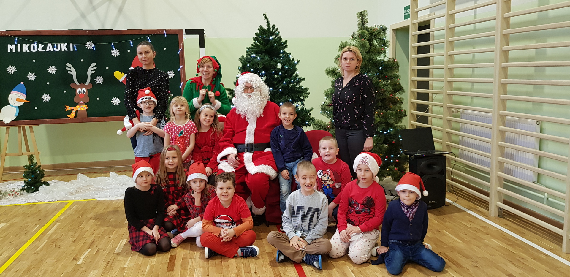 Już od rana, z sali gimnastycznej, dobiegał głośny śmiech, świąteczne melodie i okrzyki radości. Cóż tam się działo?! To elfy bawiły się z przedszkolakami, a następnie z klasami I-III, szalejąc z nimi na parkiecie i organizując różnorodne zadania. Wstrzymanie oddechu nastąpiło jednak w momencie, gdy pojawił się bardzo charakterystyczny dźwięk dzwoneczków i na salę wkroczył Mikołaj ciągnąc za sobą wielkie worki z prezentami. Widok dzieci z wypiekami na twarzach, odbierających prezenty z rąk Mikołaja – bezcenny. I nie ma się co dziwić tym wielkim emocjom. W końcu czekały na ten moment cały rok. Uroku całemu wydarzeniu dodała przygotowana przez nauczycieli dekoracja. Kadra pedagogiczna wraz z Paniami woźnymi zadbała o oprawę, a także bezpieczeństwo uczestników.