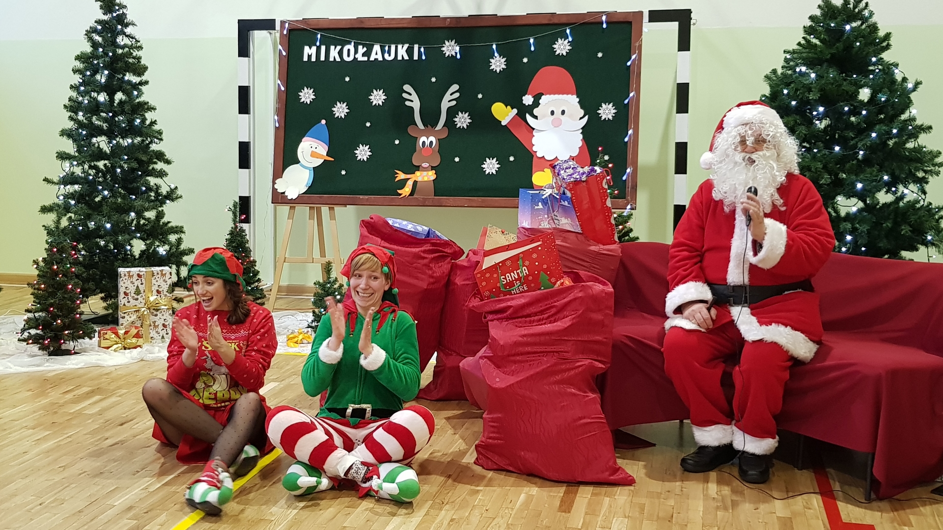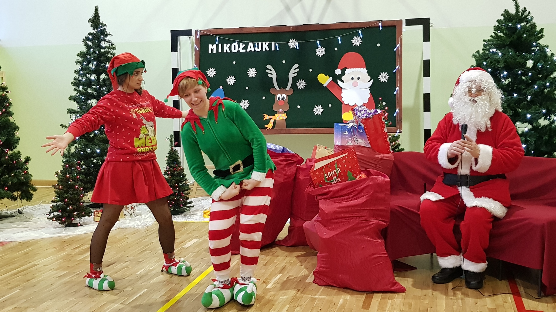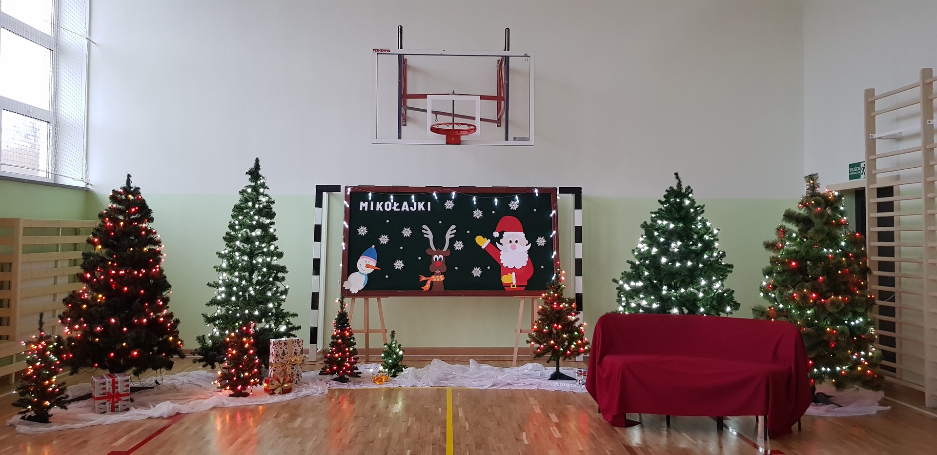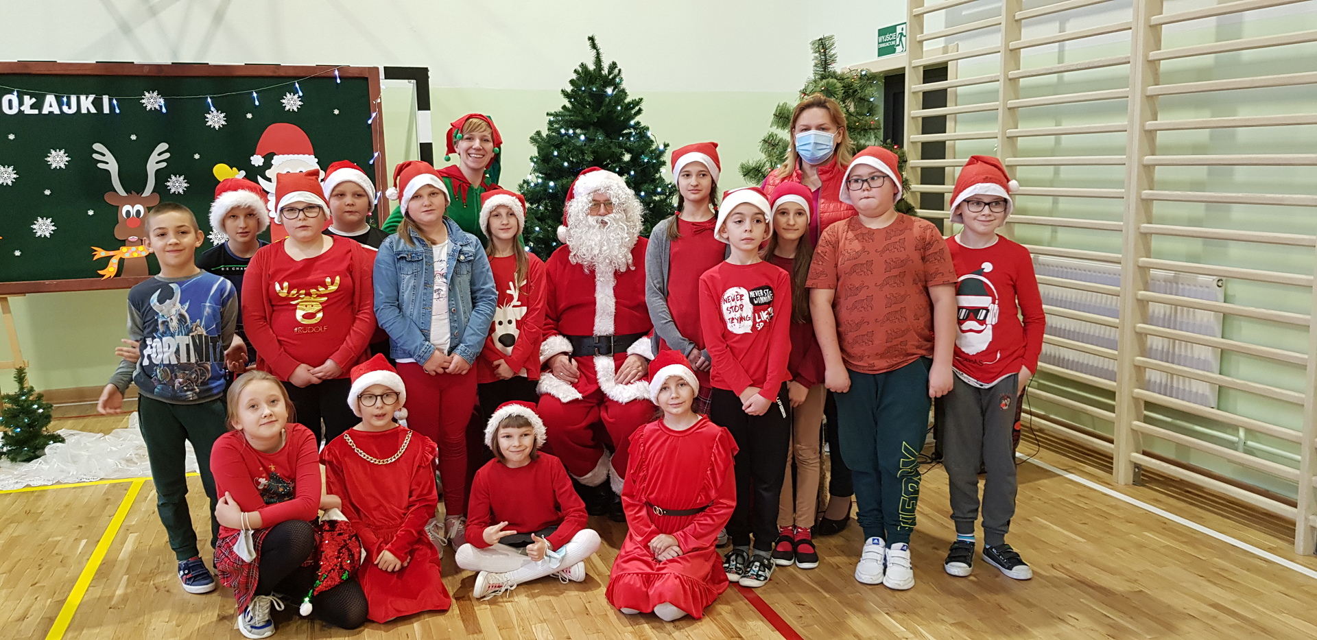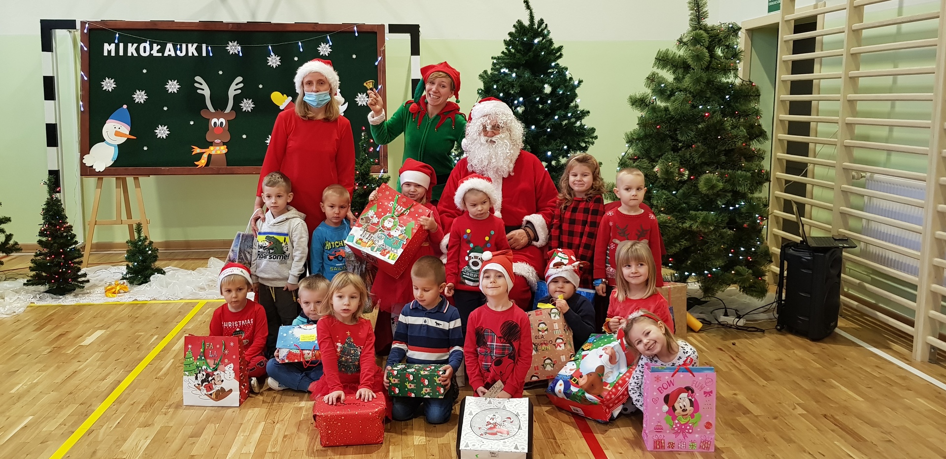 Już od rana, z sali gimnastycznej, dobiegał głośny śmiech, świąteczne melodie i okrzyki radości. Cóż tam się działo?! To elfy bawiły się z przedszkolakami, a następnie z klasami I-III, szalejąc z nimi na parkiecie i organizując różnorodne zadania. Wstrzymanie oddechu nastąpiło jednak w momencie, gdy pojawił się bardzo charakterystyczny dźwięk dzwoneczków i na salę wkroczył Mikołaj ciągnąc za sobą wielkie worki z prezentami. Widok dzieci z wypiekami na twarzach, odbierających prezenty z rąk Mikołaja – bezcenny. I nie ma się co dziwić tym wielkim emocjom. W końcu czekały na ten moment cały rok. Uroku całemu wydarzeniu dodała przygotowana przez nauczycieli dekoracja. Kadra pedagogiczna wraz z Paniami woźnymi zadbała o oprawę, a także bezpieczeństwo uczestników.