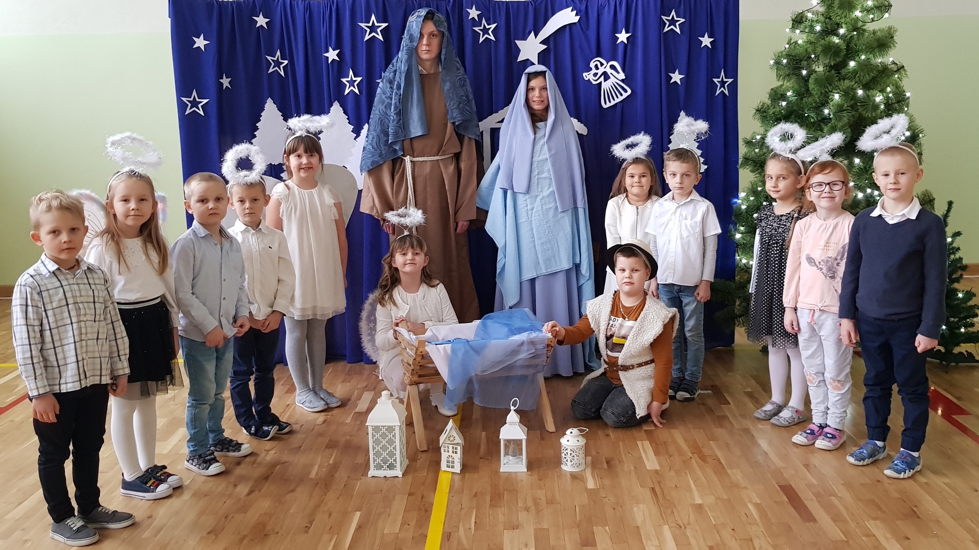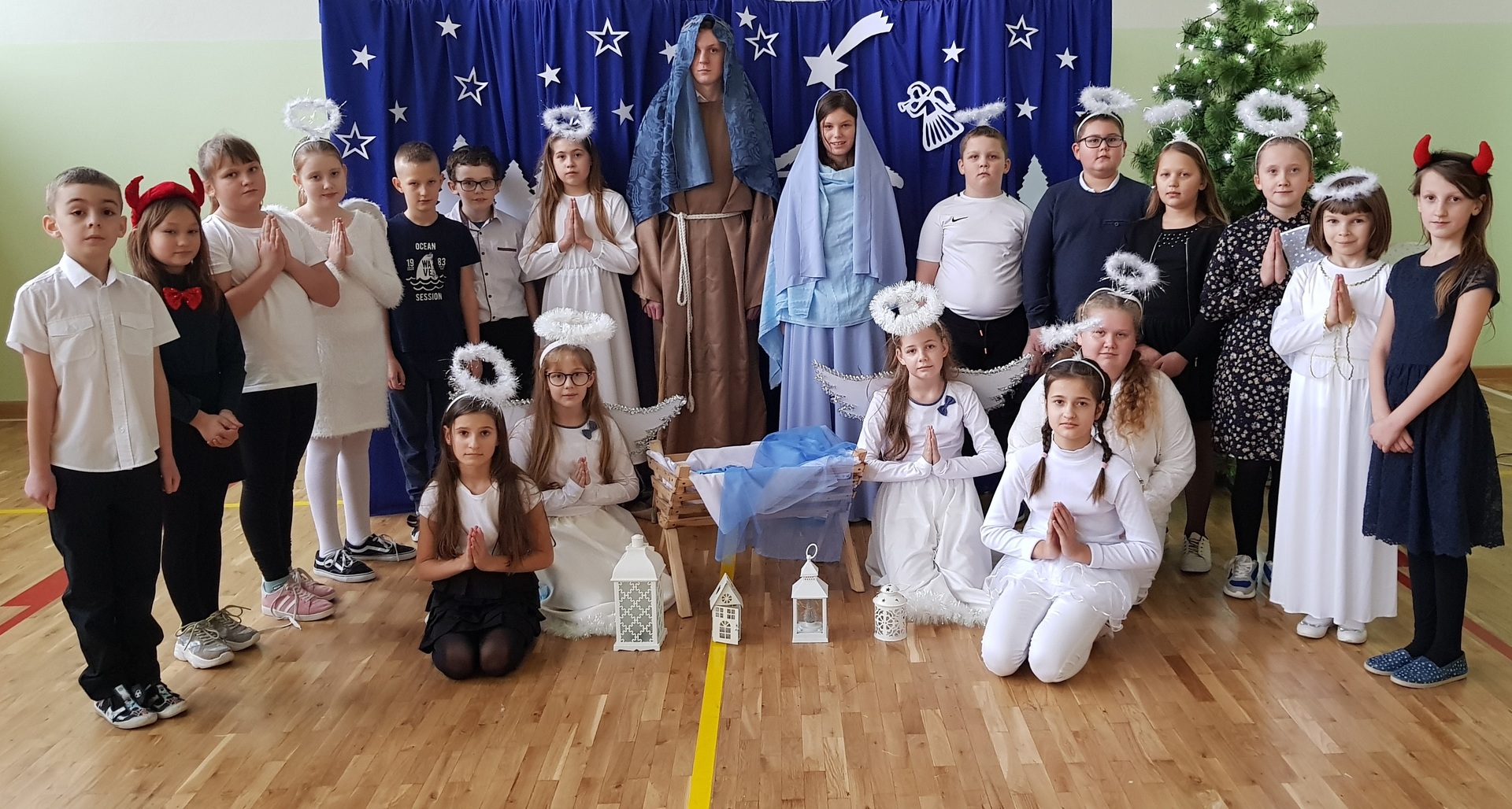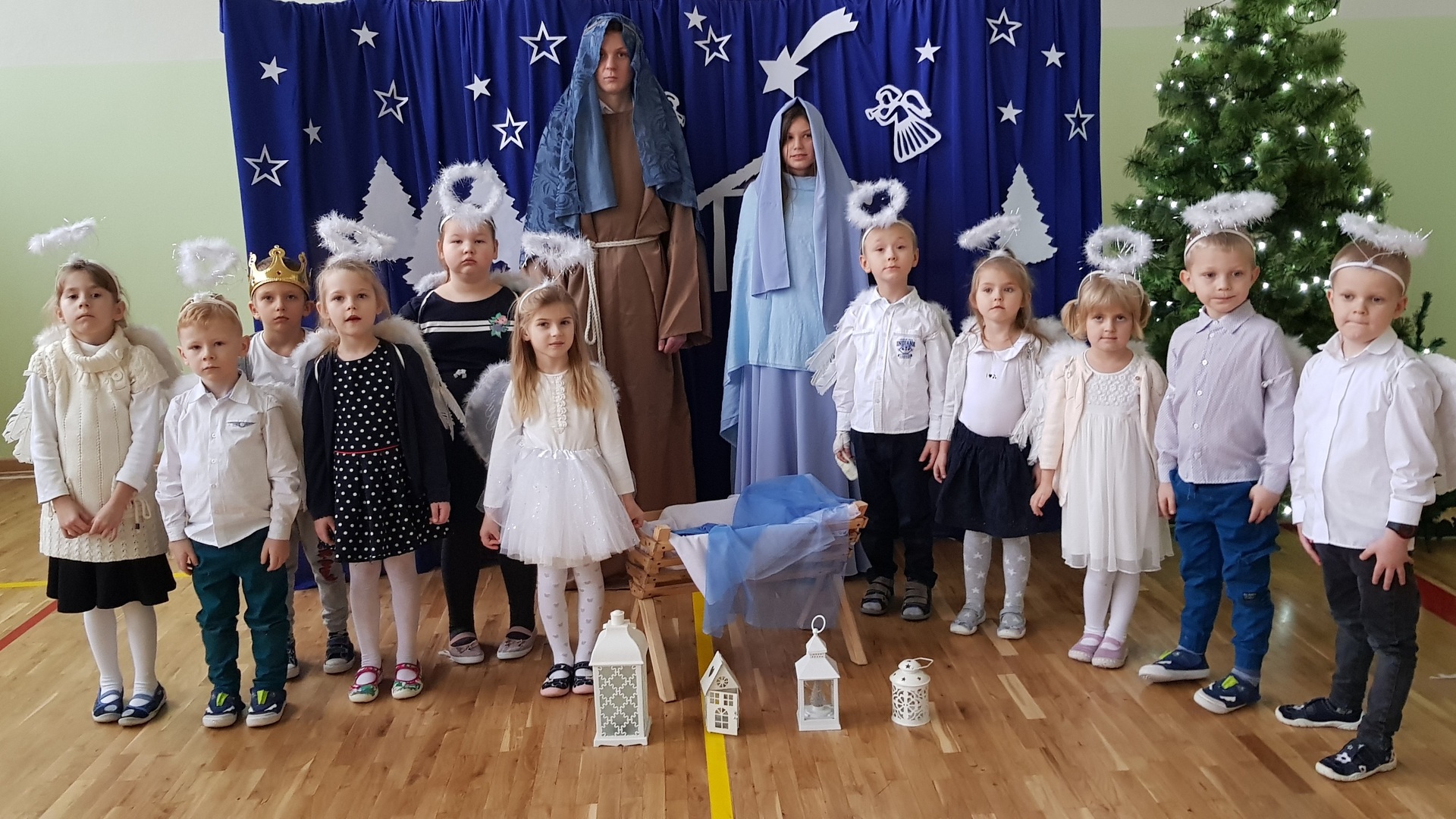 W tym roku młodsze dzieci przejęły inicjatywę i dzięki ich zaangażowaniu mogliśmy poczuć magiczny klimat, zbliżającego się wielkimi krokami, Bożego Narodzenia. Uczniowie klas I – III wspaniale wyrecytowali wiersze, które zostały napisane specjalnie na tę okazję. Zawierały w sobie nie tylko istotę i głębię tych świąt, ale odnosiły się również do obecnej trudnej sytuacji w kraju. Pomiędzy wystąpieniami odbywało się wspólne kolędowanie. Swoje piękne głosy zaprezentowały uczennice z klasy ósmej i szóstej, a mały 5-letni aniołek uraczył nas subtelną grą kolędy na dzwonkach.