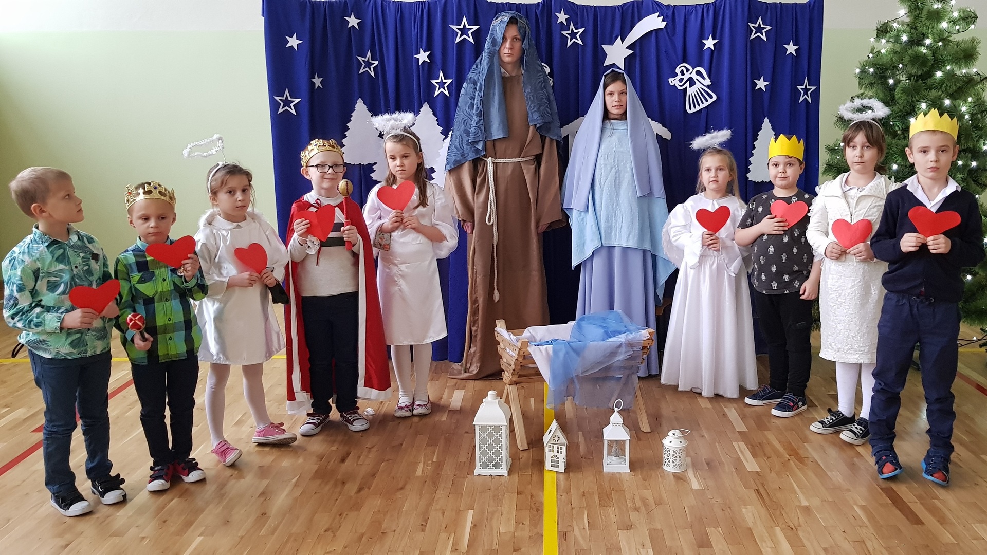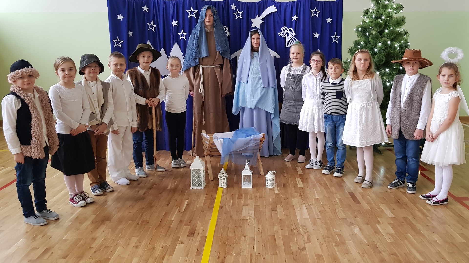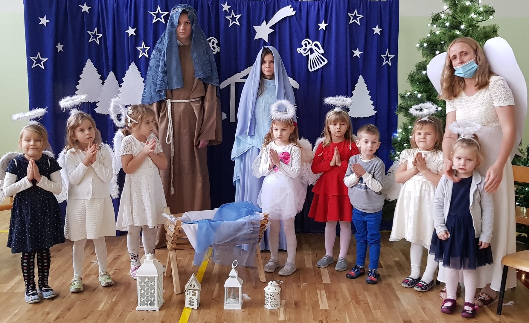 W tym roku młodsze dzieci przejęły inicjatywę i dzięki ich zaangażowaniu mogliśmy poczuć magiczny klimat, zbliżającego się wielkimi krokami, Bożego Narodzenia. Uczniowie klas I – III wspaniale wyrecytowali wiersze, które zostały napisane specjalnie na tę okazję. Zawierały w sobie nie tylko istotę i głębię tych świąt, ale odnosiły się również do obecnej trudnej sytuacji w kraju. Pomiędzy wystąpieniami odbywało się wspólne kolędowanie. Swoje piękne głosy zaprezentowały uczennice z klasy ósmej i szóstej, a mały 5-letni aniołek uraczył nas subtelną grą kolędy na dzwonkach.