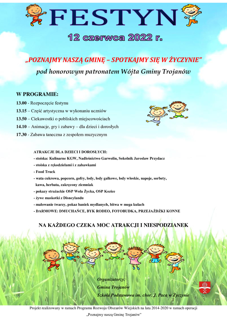 Zapraszamy wszystkich na Festyn, który odbędzie się w dniu 12 czerwca 2022 r. (niedziela) na terenie Szkoły Podstawowej w Życzynie. Moc atrakcji gwarantowana.