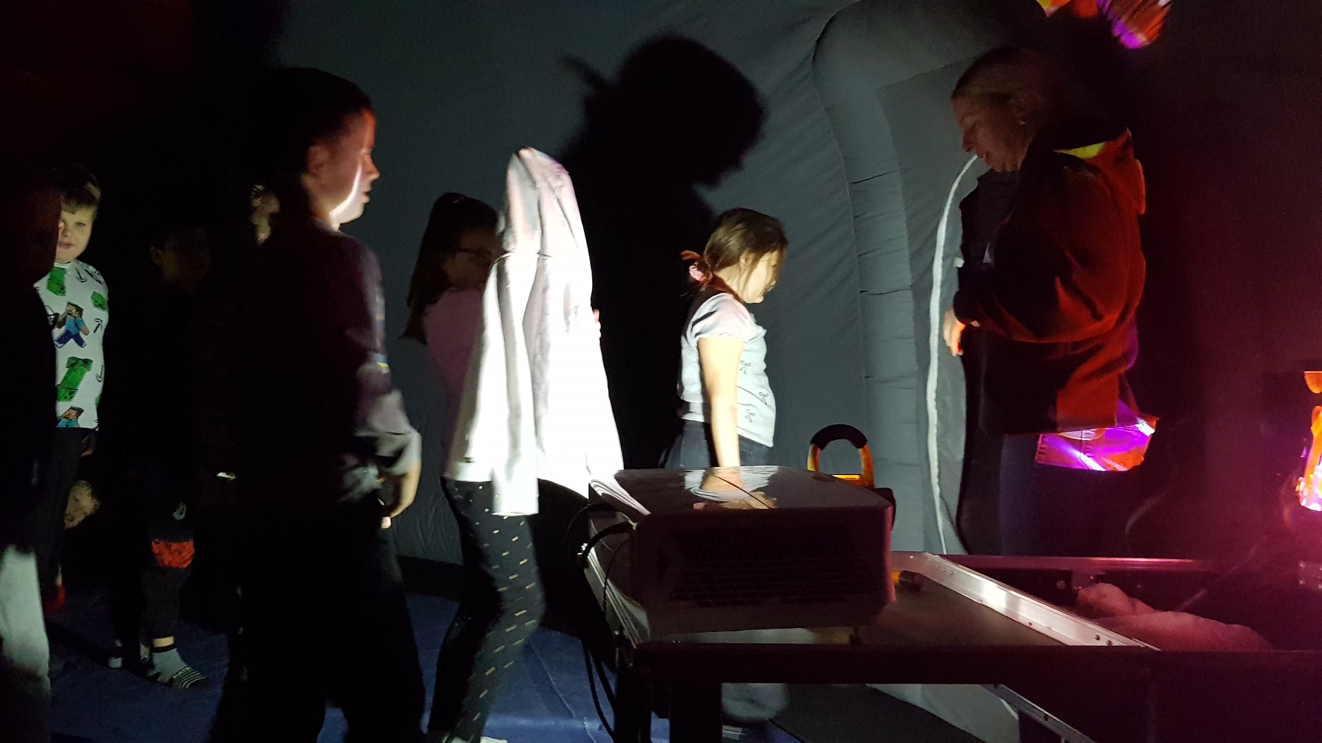 Pod ogromną kopułą namiotu, przy wykorzystaniu technik multimedialnych oraz audiowizualnych nasi uczniowie podziwiali animacje prezentujące wiadomości o układzie słonecznym. Mieli okazję oglądać rozgwieżdżone niebo, konstelacje gwiazd, zorzę polarną oraz przyswajali wiedzę o kosmosie. Mogli bardzo realistycznie zanurzyć się w bezkres kosmosu, wraz z planetami, meteorytami i kometami.