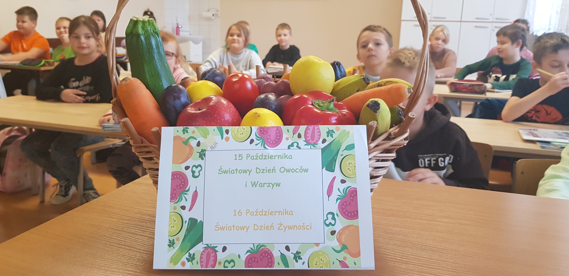W dniu 15 października obchodzimy Światowy Dzień Owoców i Warzyw. W tym dniu dzieci przyniosły do szkoły warzywa i owoce. W klasach powstały piękne, kolorowe kosze wypełnione zdrowymi produktami. Wspólnie omawiano walory zdrowotne tych produktów, odsłuchano słuchowisko "Owocowe spory", a na koniec odbyła się pyszna degustacja.