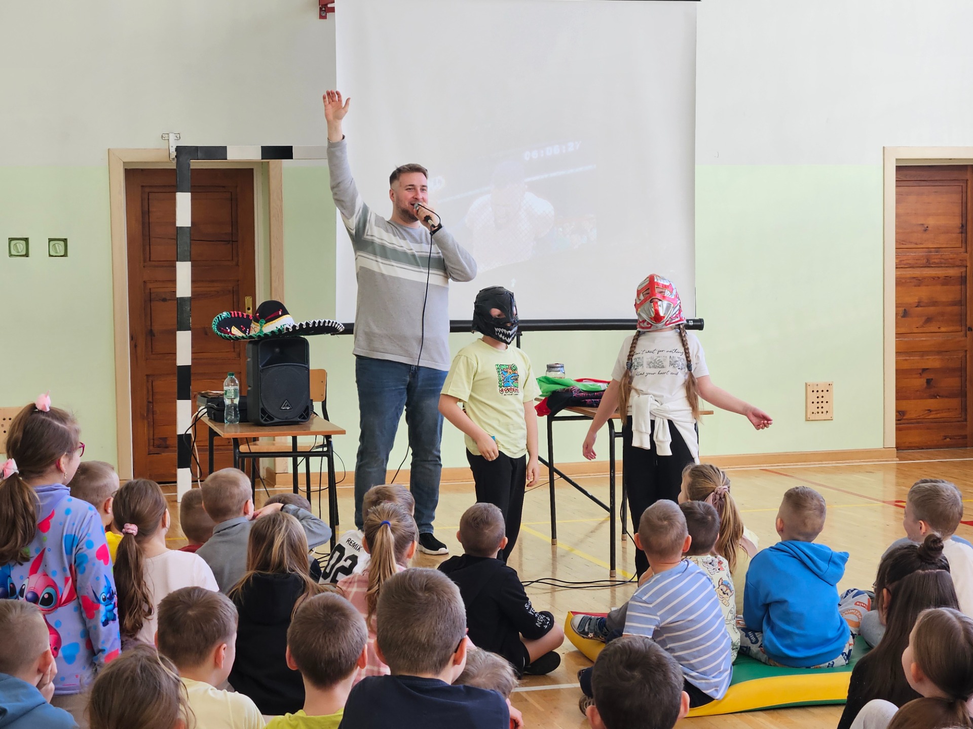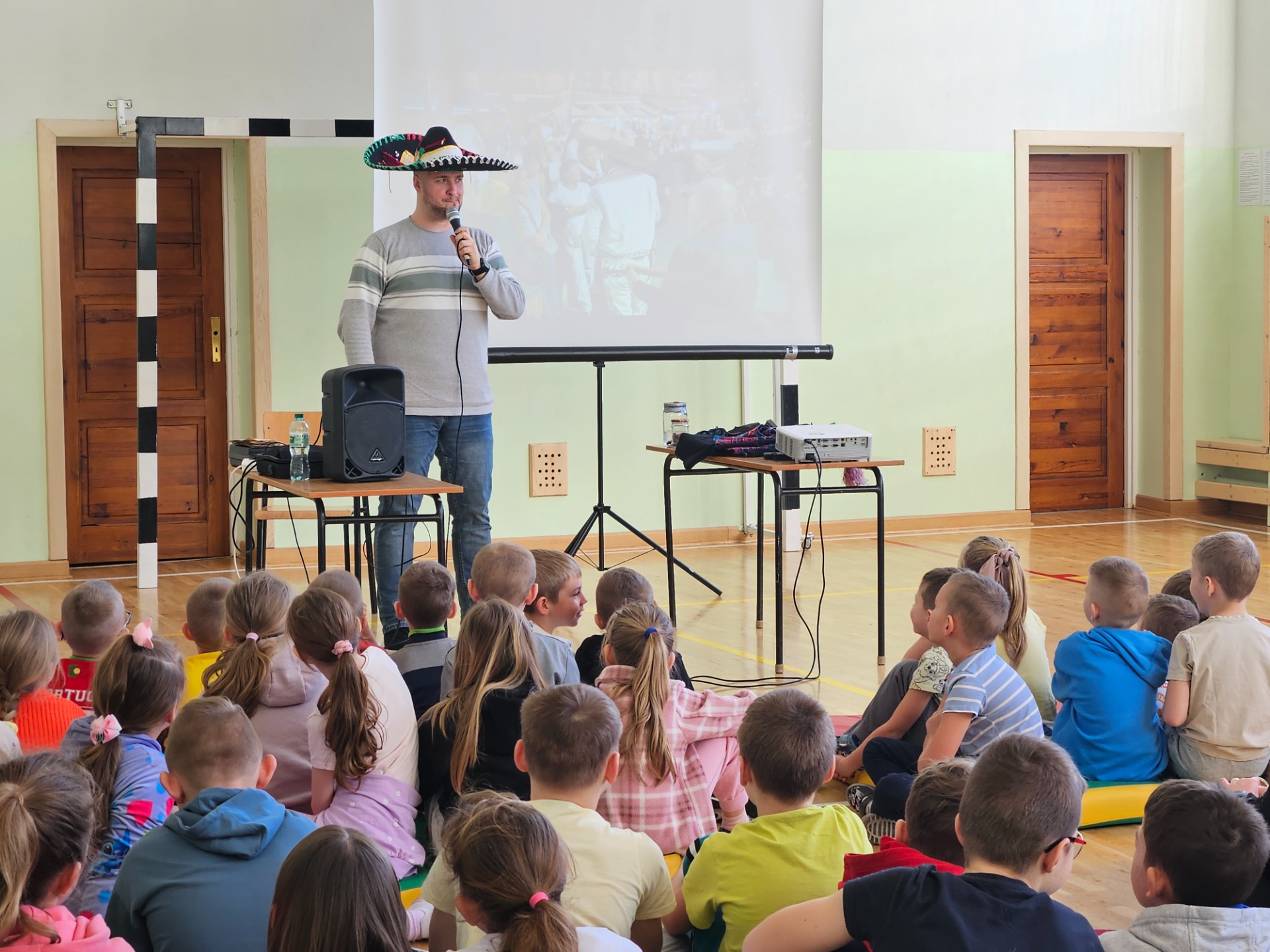 Podróżnik przywiózł ze sobą rekwizyty z Meksyku, które uczniowie mogli obejrzeć i wypróbować, takie jak sombrero, ponczo czy regionalne tkaniny. To spotkanie było wyjątkową lekcją geografii, historii i kultury, ukazującą jak fantastyczne i rozwijające mogą być takie podróże.