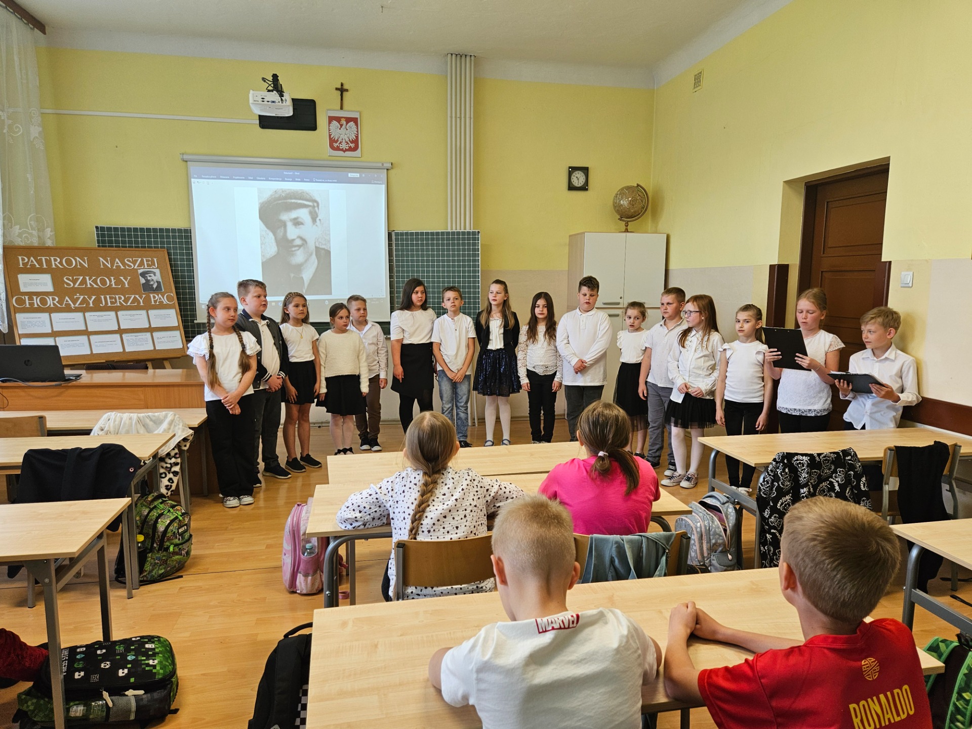 Jak co roku w naszej szkole obchodziliśmy Dzień Patrona – chorążego Jerzego Paca. Tegoroczne obchody miały inny charakter, niż tradycyjna akademia. Uczniowie klas II i III przygotowali ciekawą prezentację sylwetki patrona w formie quizu, który w przystępny i angażujący sposób przybliżył wszystkim postać Jerzego Paca. Po zakończeniu quizu uczniowie aktywnie uczestniczyli w sesji pytań, odpowiadając na zagadnienia związane z usłyszanymi treściami i otrzymując w nagrodę słodką niespodziankę. Była to nie tylko wspaniała okazja do poznania historii naszego patrona, ale również do doskonalenia współpracy w grupie i ćwiczenia koncentracji.