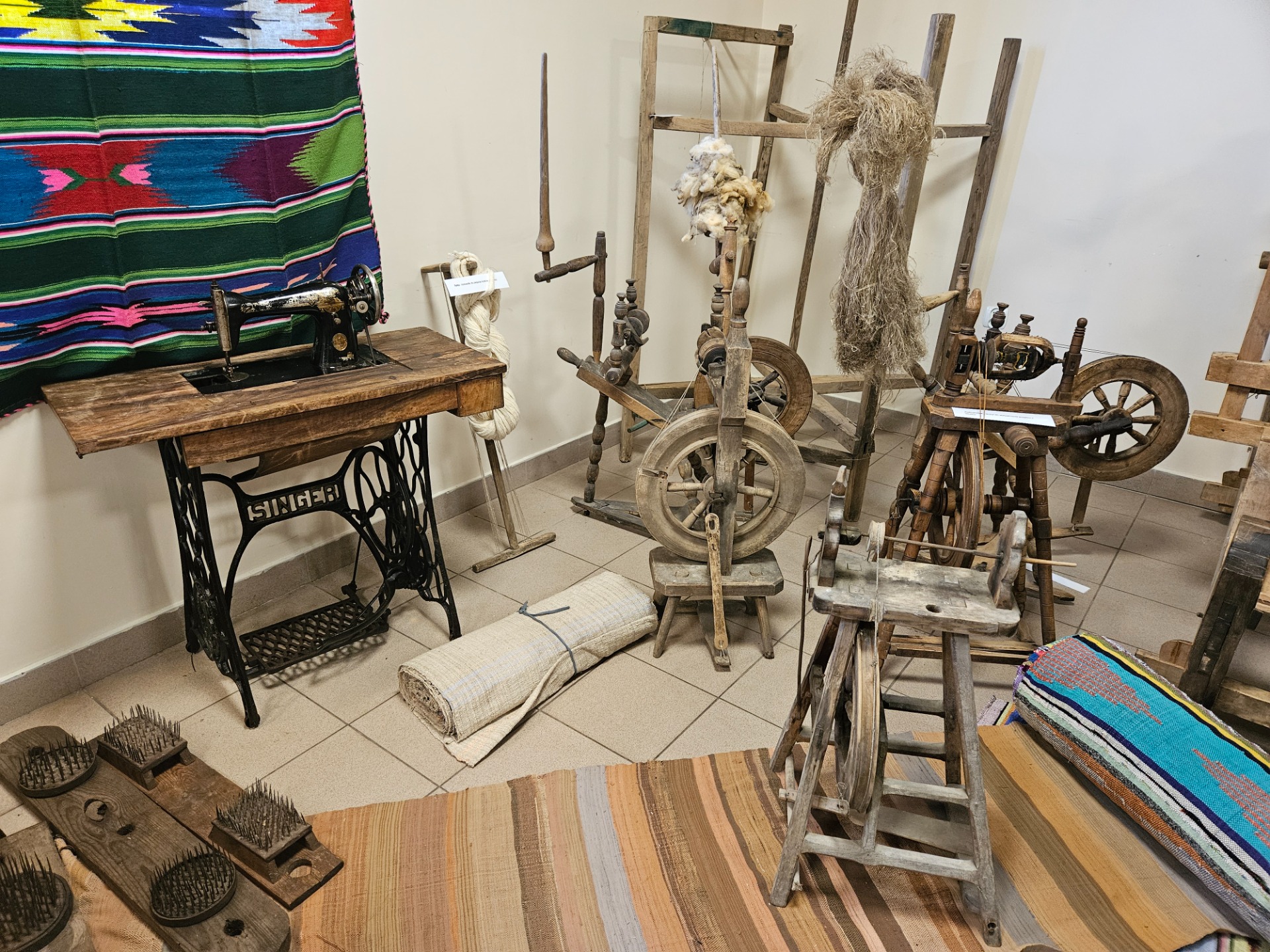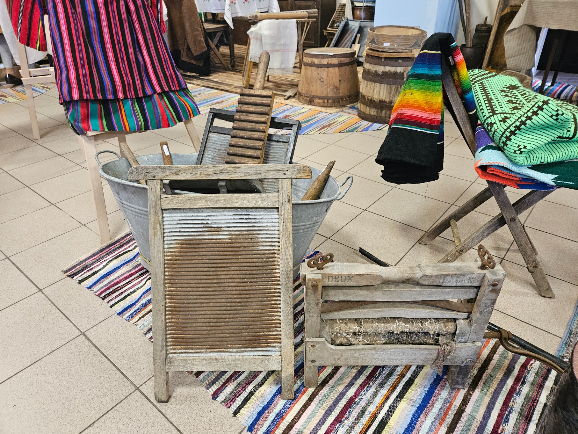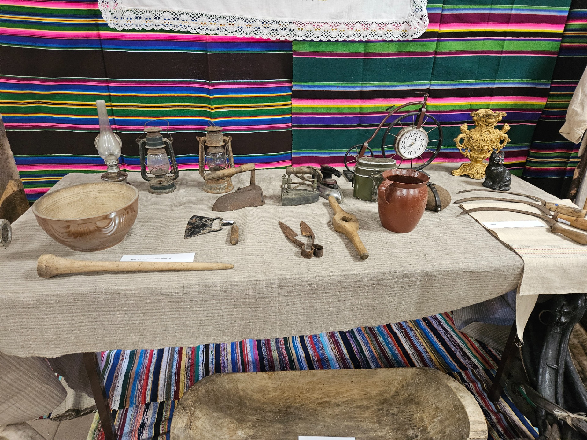 Podziwialiśmy m.in. maselnicę na korbkę, piłę ramową, strugi drewniane, podwójny grzebień Dzieżgoń do wyczesywania lnu, cierlice do jego międlenia, motowidło – talkę – do zwijania motków wełny, kołowrotki do przędzenia, a także krosno tkackie i nicielnicę. Wśród eksponatów znalazły się też bodnia do rozczyniania mąki i przygotowania ciasta chlebowego, przetak do przesiewania zboża oraz dzieża – drewniana niecka do wyrabiania ciasta. Nie zabrakło też narzędzi gospodarskich, takich jak tasaki, sierpy czy inne przybory codziennego użytku.