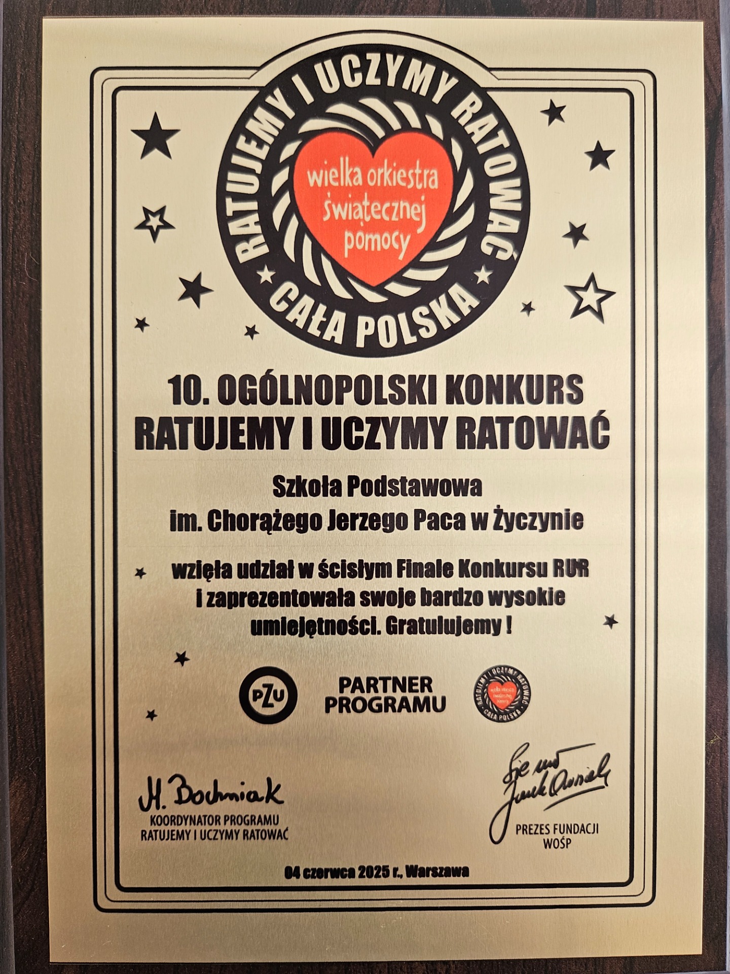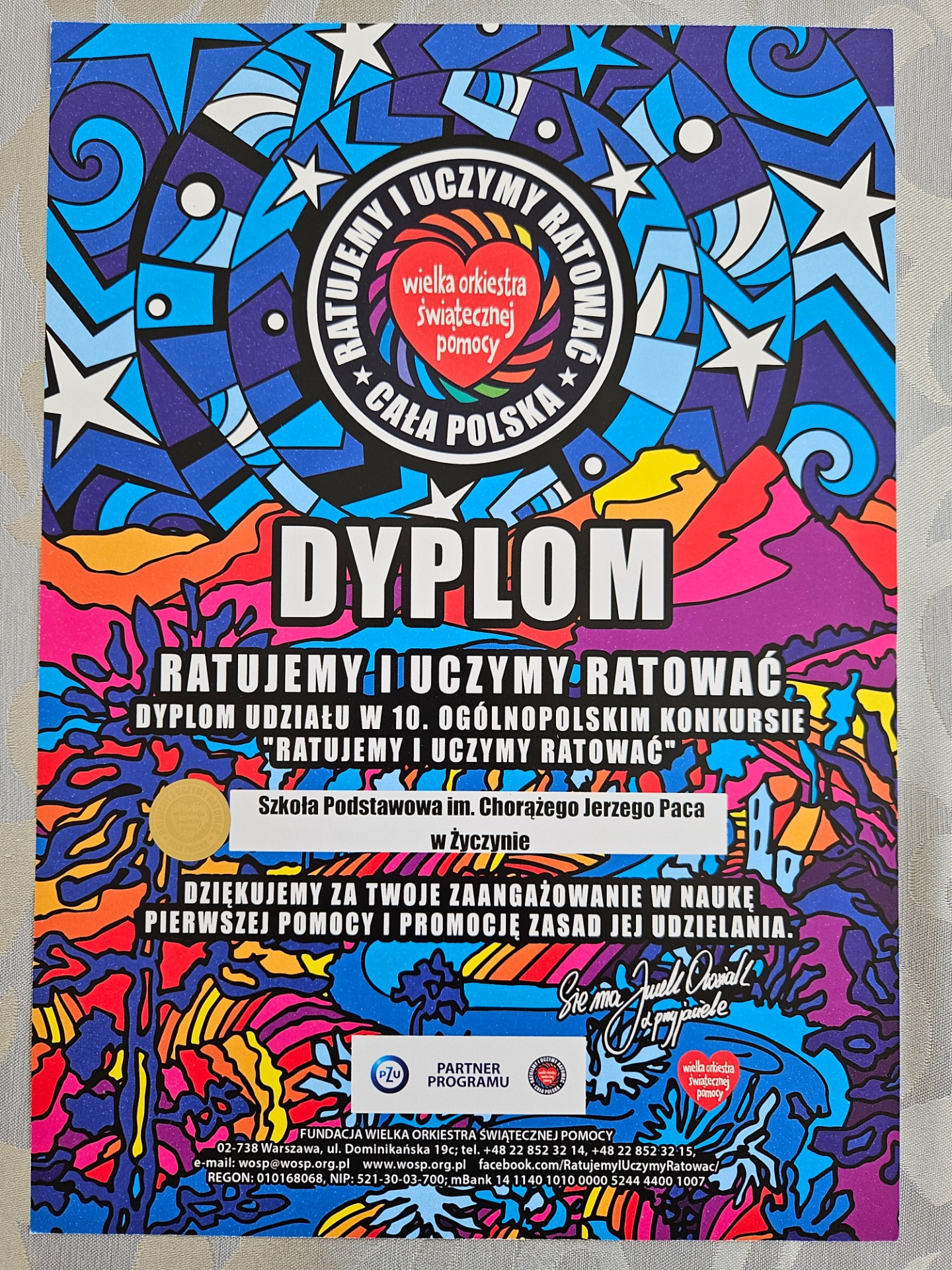 Z ogromną radością informujemy, że uczniowie klasy III Szkoły Podstawowej w Życzynie wzięli udział w X edycji ogólnopolskiego konkursu "Ratujemy i uczymy ratować", organizowanego przez Fundację WOŚP. Konkurs miał na celu promowanie wiedzy i umiejętności z zakresu udzielania pierwszej pomocy wśród najmłodszych.