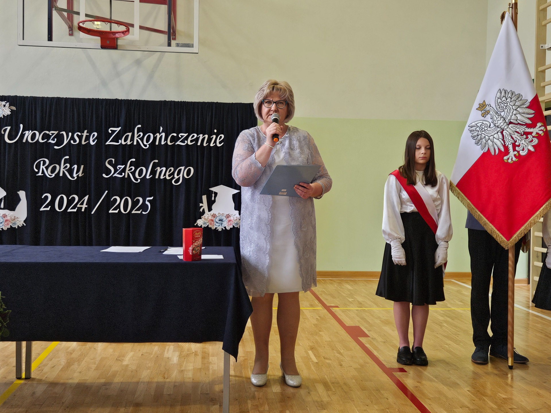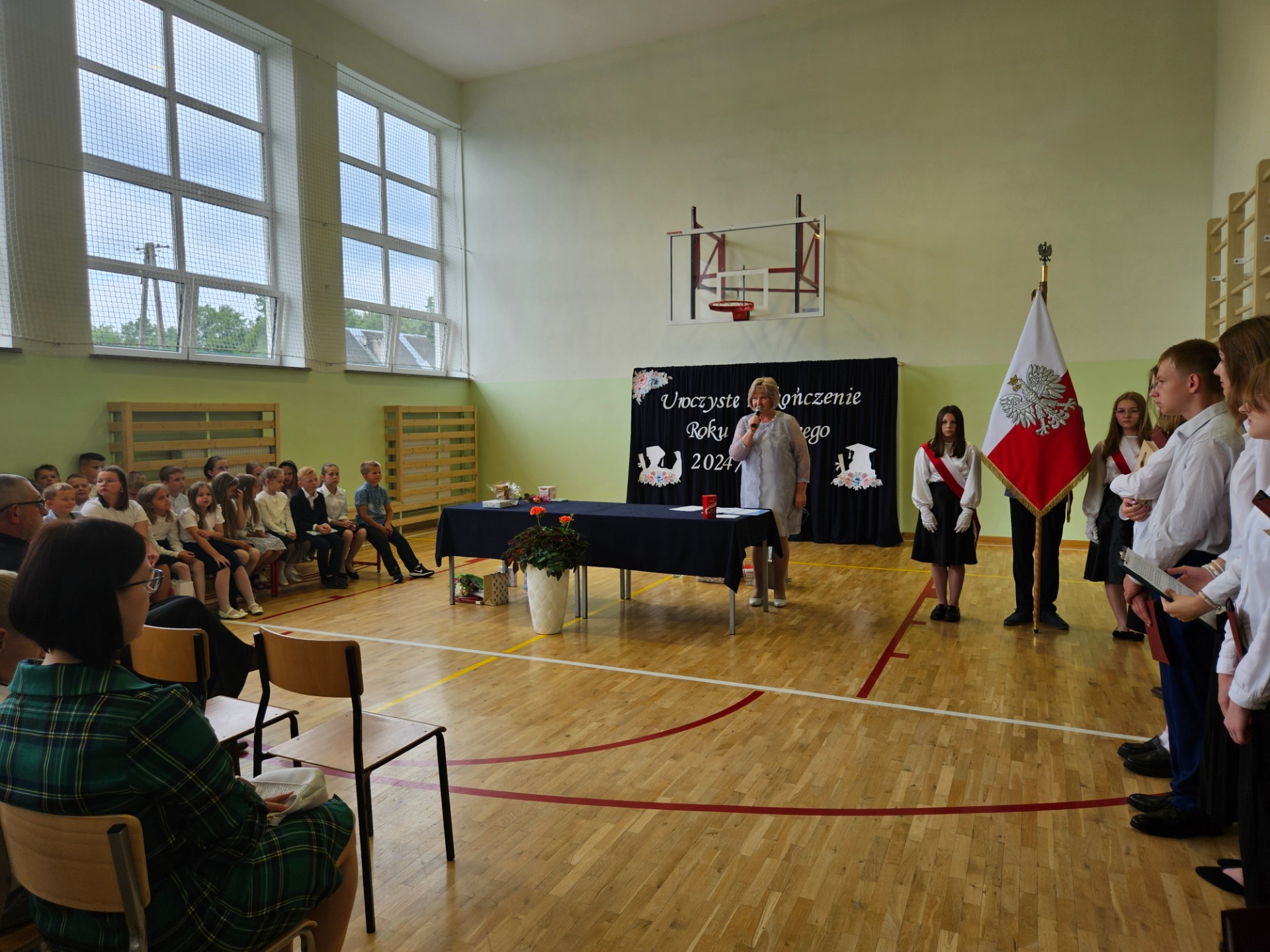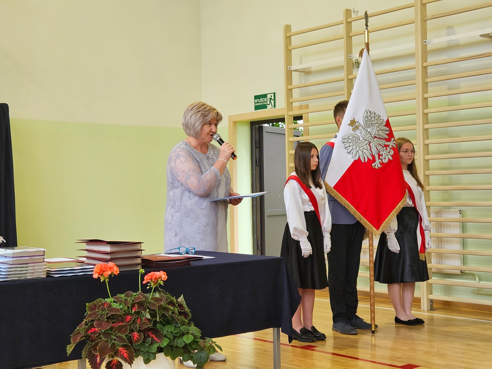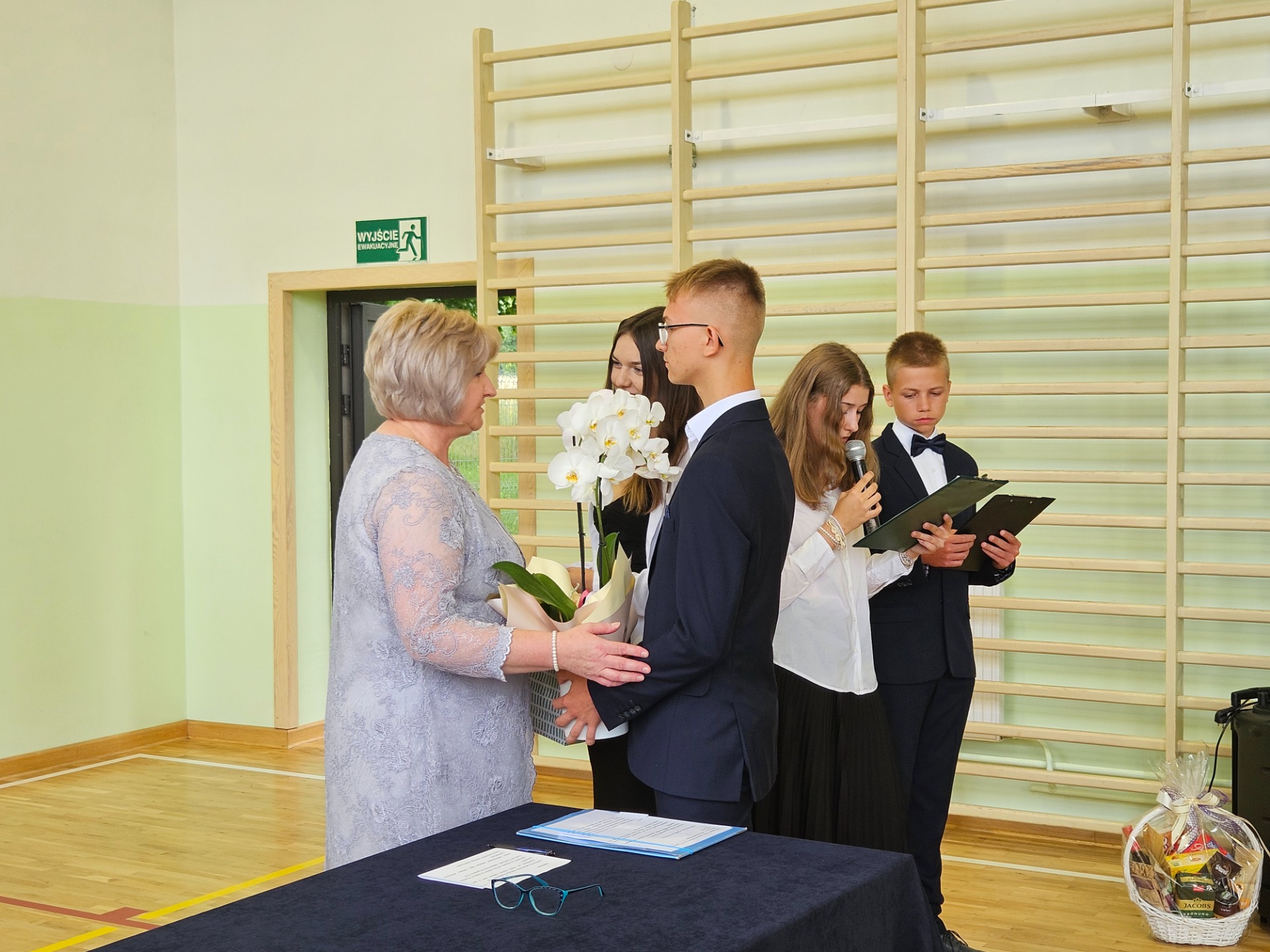 Następnie cała społeczność szkolna zebrała się na sali gimnastycznej, gdzie miała miejsce oficjalna część uroczystości. Uczniowie, którzy osiągnęli najwyższe wyniki w nauce, otrzymali z rąk swoich wychowawców świadectwa z wyróżnieniem – z biało-czerwonym paskiem oraz pamiątkowe książki. Pani Dyrektor wręczyła również listy gratulacyjne rodzicom uczniów, którzy w minionym roku szkolnym wykazali się nie tylko bardzo dobrymi wynikami w nauce, ale także wzorową postawą.