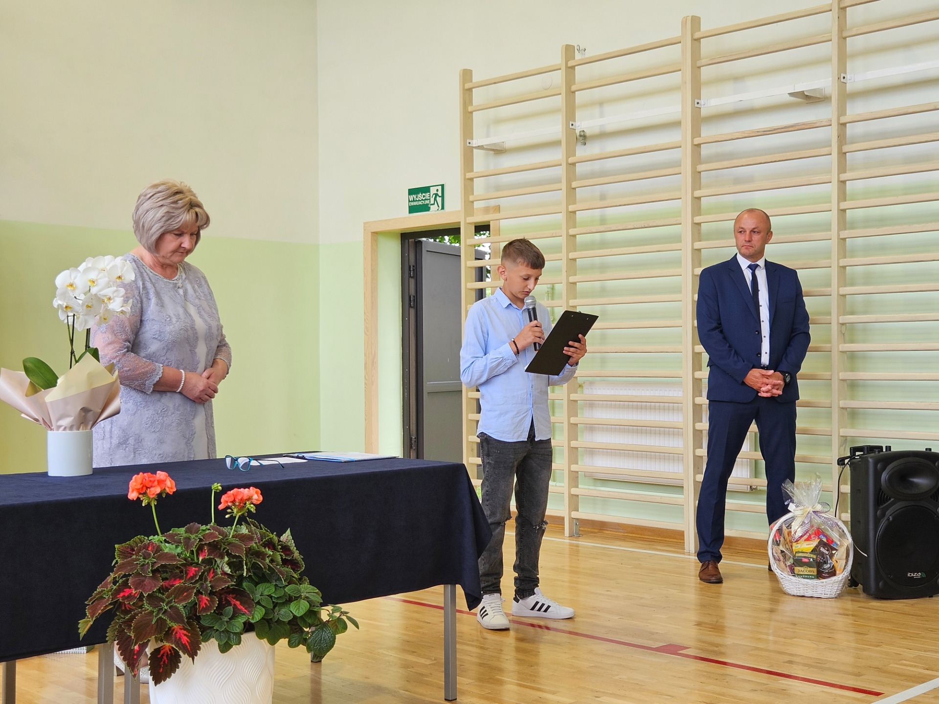 Nie zabrakło również momentów wzruszeń – pożegnaliśmy uczniów klasy ósmej, którzy po latach nauki opuszczają mury naszej szkoły. Przedstawiciele klasy ósmej podziękowali nauczycielom, wychowawcom oraz młodszym kolegom za wspólnie spędzone lata, a uczeń z klasy siódmej, w imieniu całej społeczności uczniowskiej, pożegnał tegorocznych absolwentów.”
