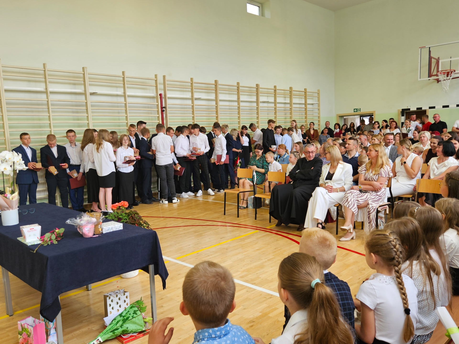 W dniu 27 czerwca 2025 roku w naszej szkole odbyło się uroczyste zakończenie roku szkolnego 2024/2025. Tradycyjnie rozpoczęliśmy ten wyjątkowy dzień mszą świętą w intencji uczniów, nauczycieli oraz wszystkich pracowników szkoły – dziękując za mijający rok, pełen wyzwań, pracy i sukcesów.