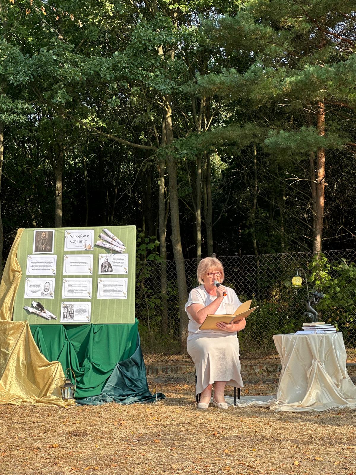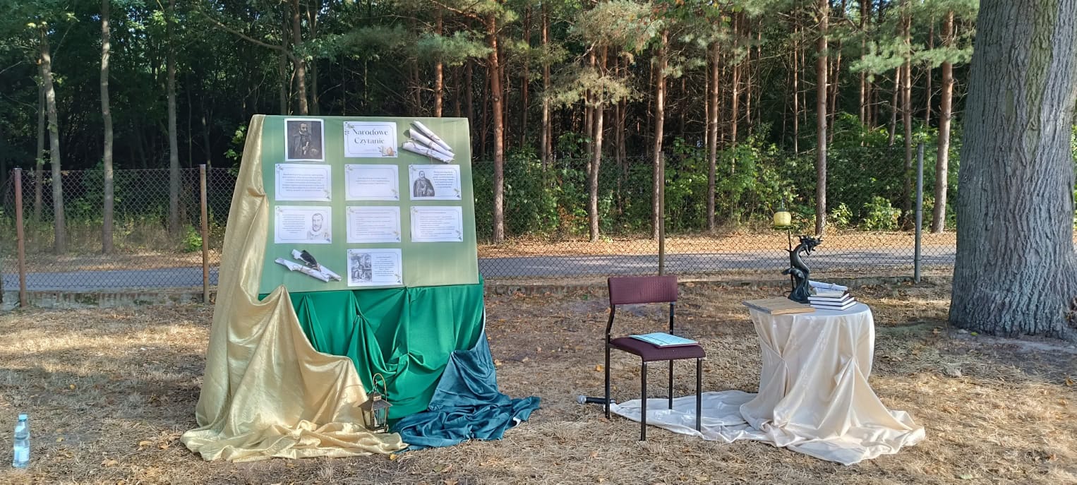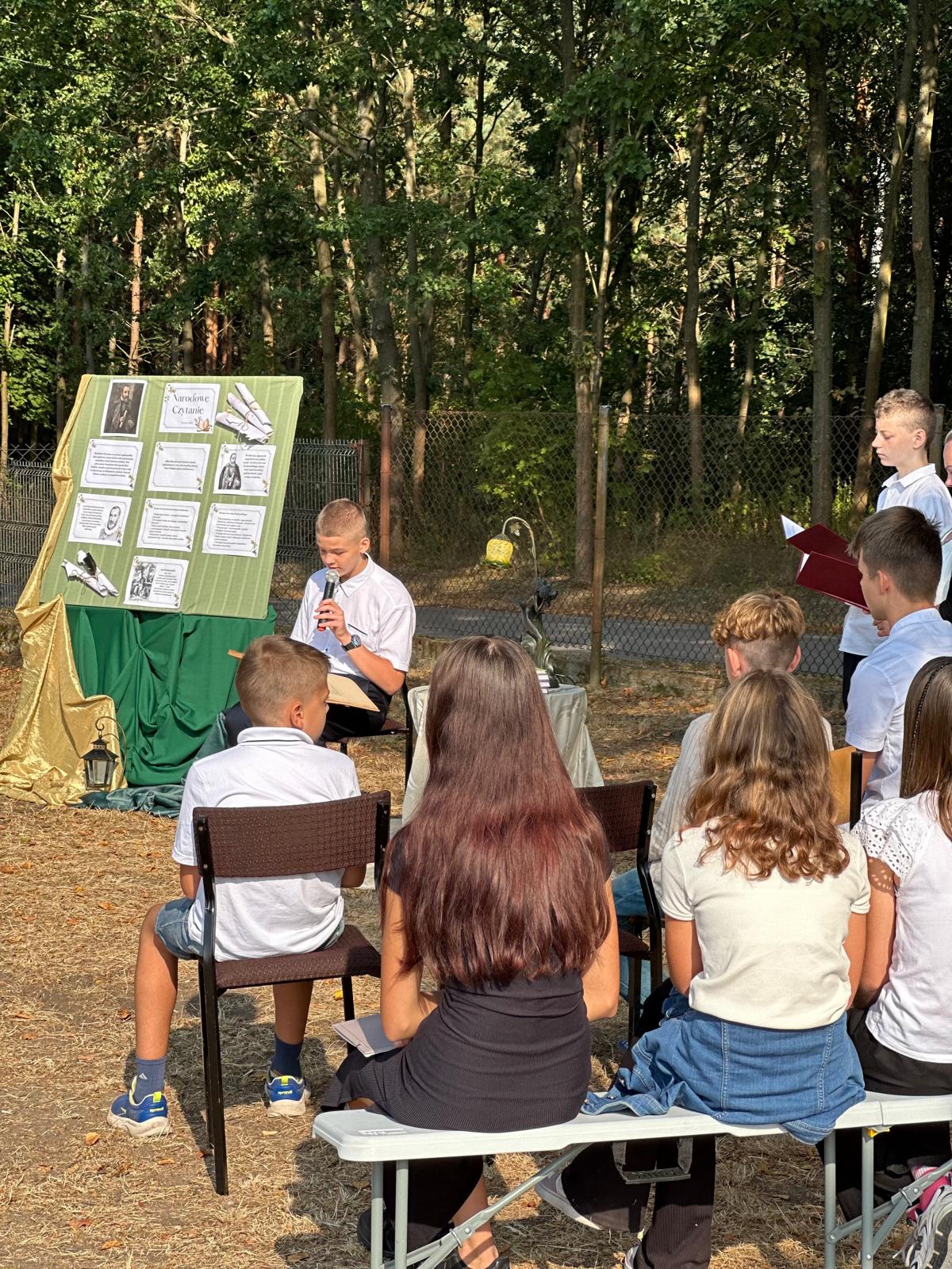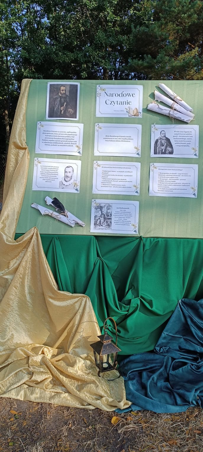 W piątek, 5 września 2025 r., nasza szkoła włączyła się w ogólnopolską akcję, promującą czytelnictwo, pod honorowym patronatem Pary Prezydenckiej Narodowe Czytanie 2025. Wydarzenie, w którym wzięły udział klasy IV–VIII, poświęcone było twórczości Jana Kochanowskiego i miało wyjątkowy, poetycki charakter, ponieważ odbyło się w plenerze, w cieniu rozłożystych lip, przy sprzyjającej aurze i nastrojowej oprawie muzycznej.