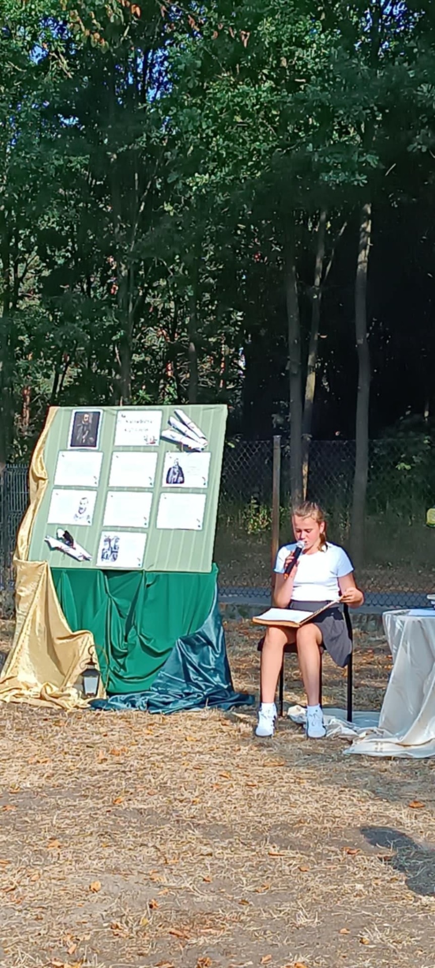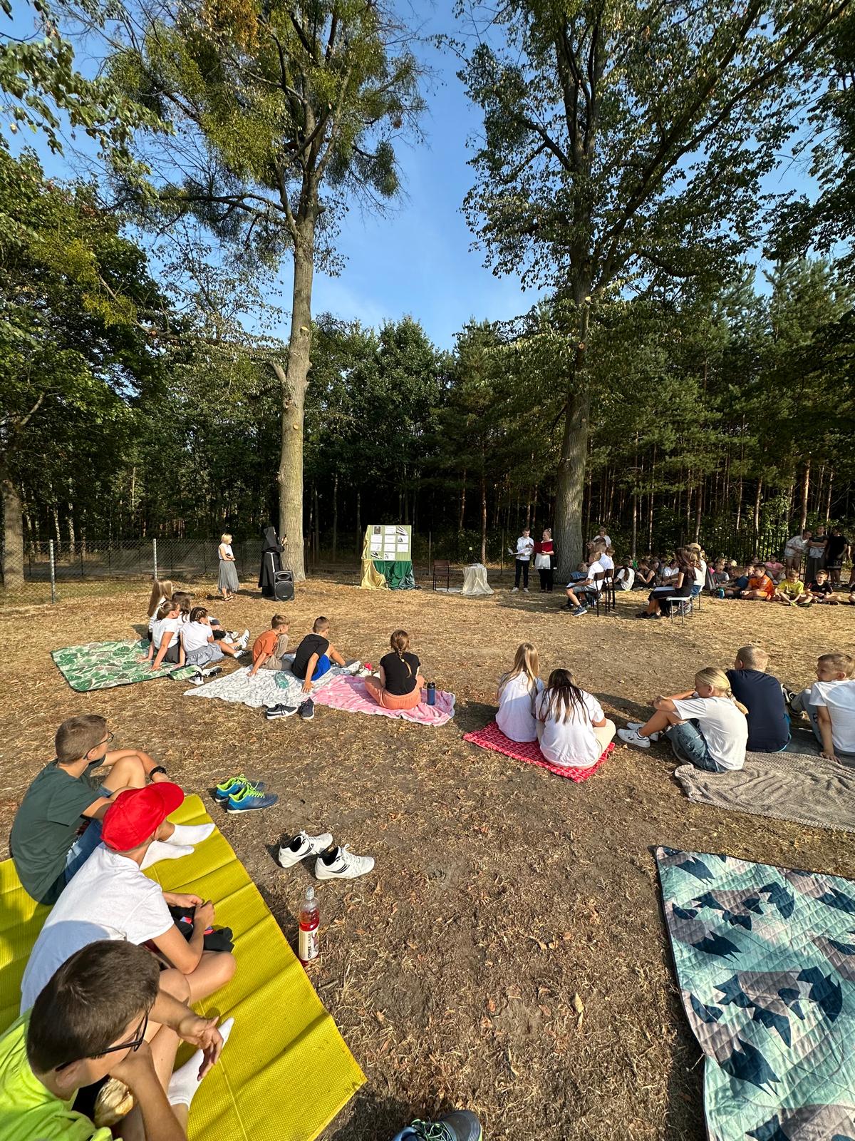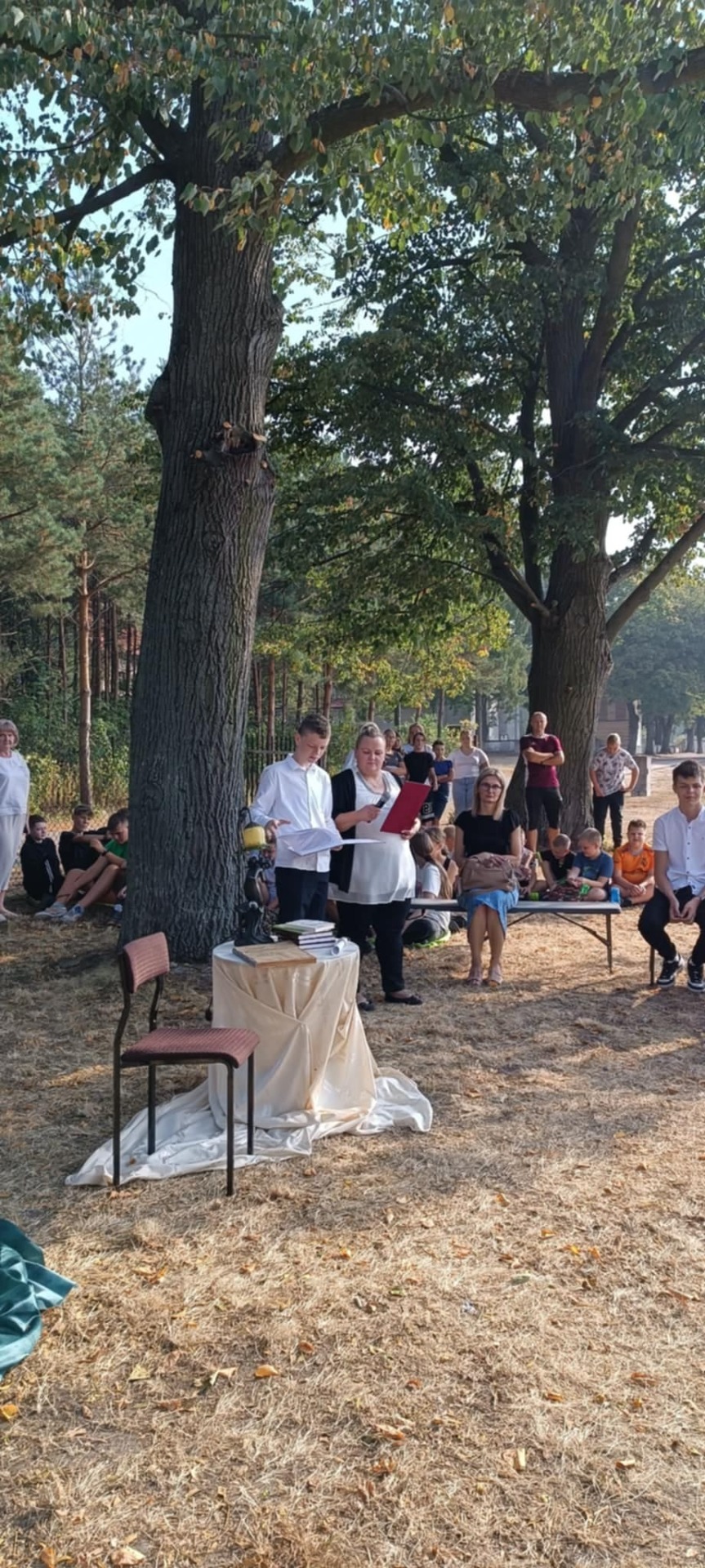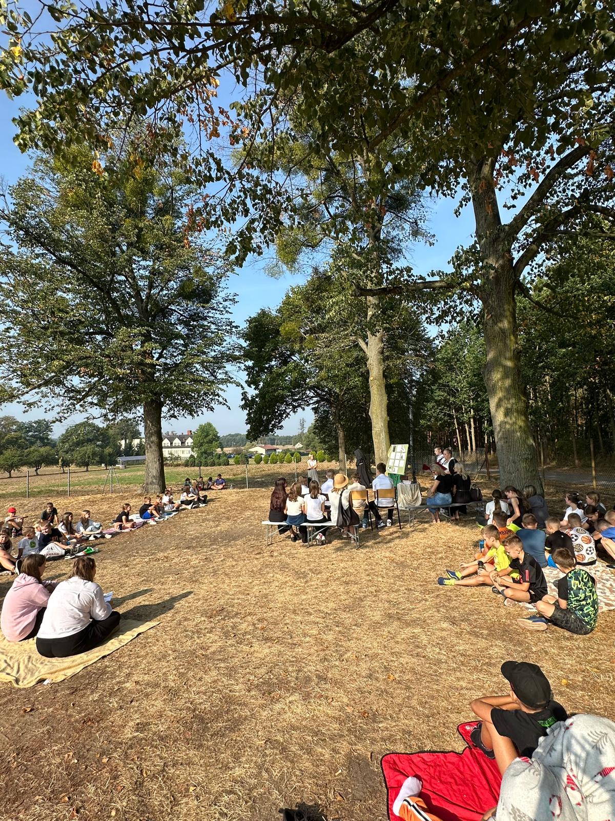 W piątek, 5 września 2025 r., nasza szkoła włączyła się w ogólnopolską akcję, promującą czytelnictwo, pod honorowym patronatem Pary Prezydenckiej Narodowe Czytanie 2025. Wydarzenie, w którym wzięły udział klasy IV–VIII, poświęcone było twórczości Jana Kochanowskiego i miało wyjątkowy, poetycki charakter, ponieważ odbyło się w plenerze, w cieniu rozłożystych lip, przy sprzyjającej aurze i nastrojowej oprawie muzycznej.