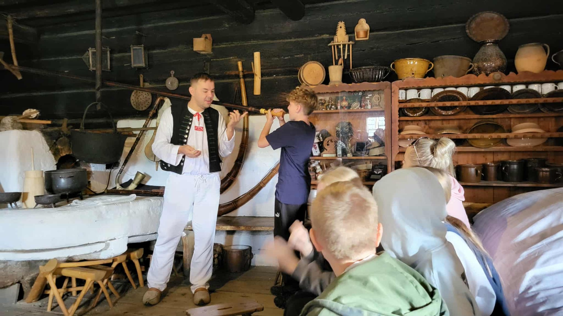 Drugiego dnia zwiedzanie rozpoczęliśmy od Chaty Kawuloka, która stanowi przykład tradycyjnego góralskiego domu drewnianego. Historię góralskich tradycji przybliżył nam w niezwykle interesujący sposób kustosz obiektu. Opowieści były przeplatane grą na instrumentach pasterskich, na których mieli możliwość zagrać również nasi uczniowie.