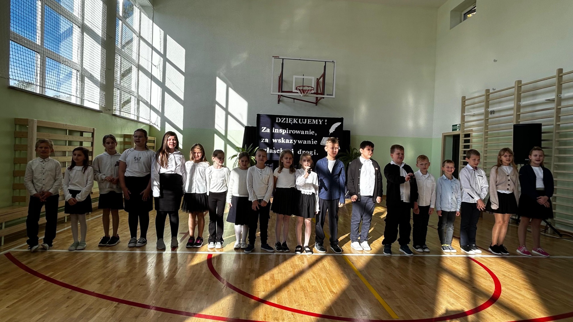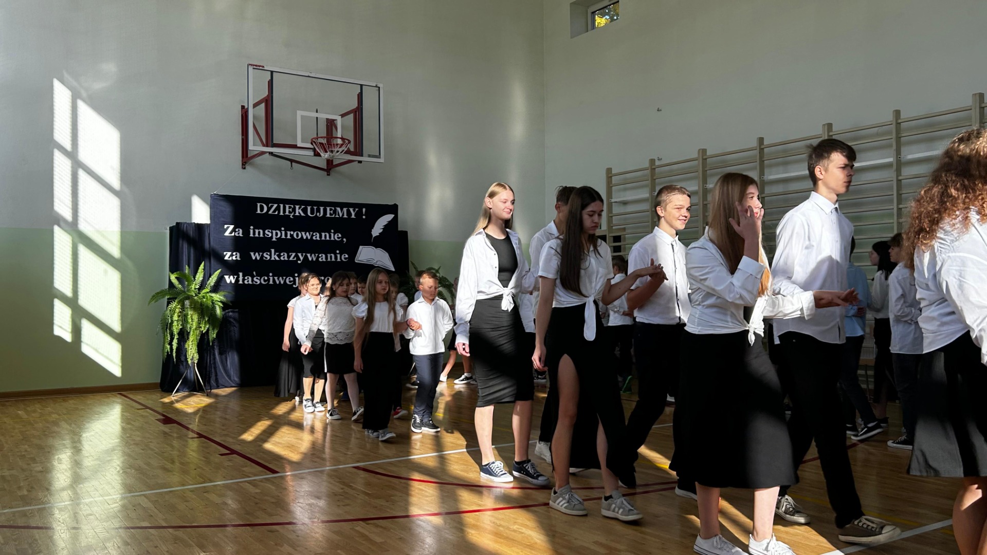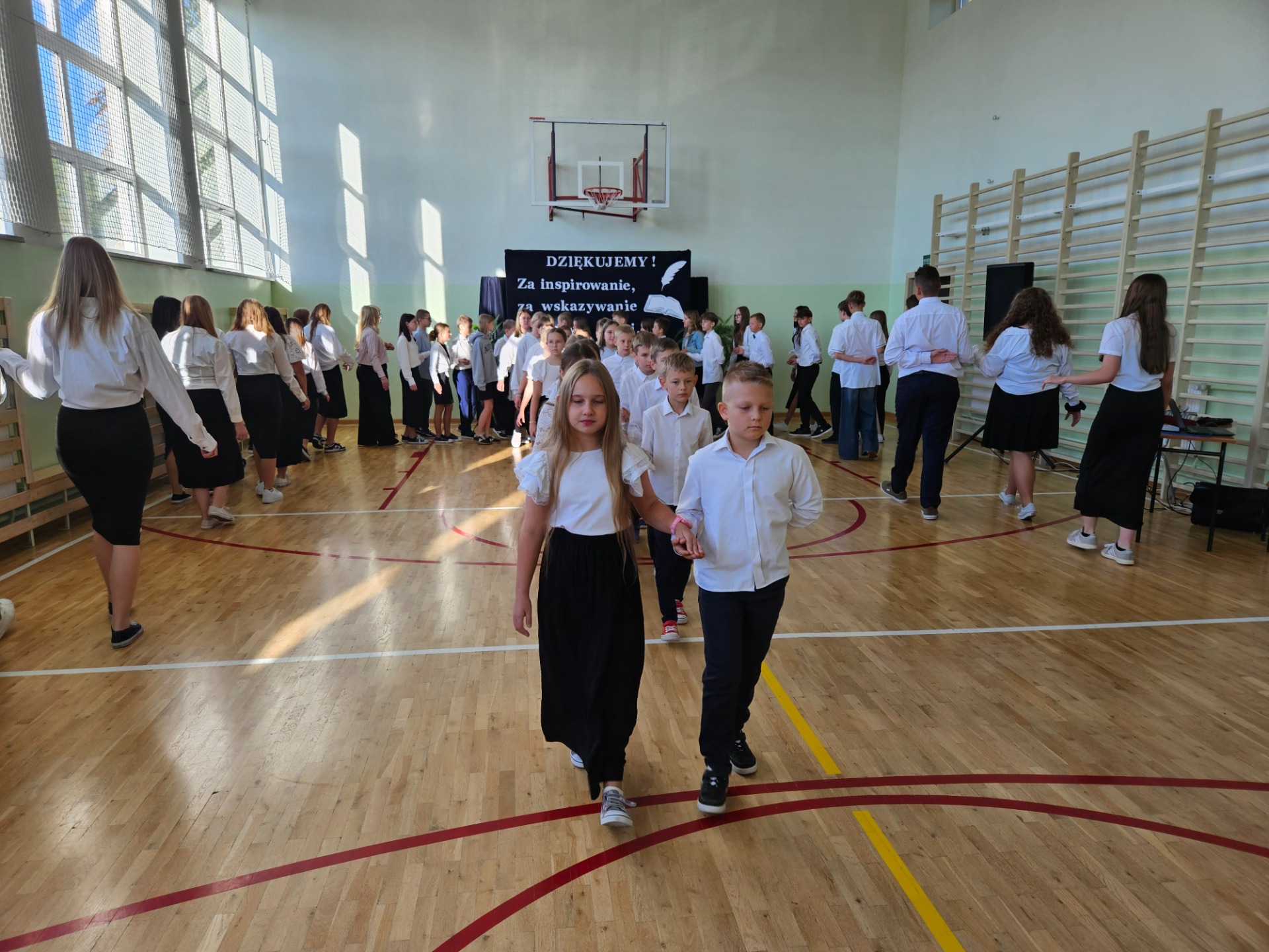 Nie zabrakło również akcentu tanecznego – uczniowie klas IV–VIII zaprezentowali pięknego poloneza, który wprowadził wszystkich w niezwykle podniosły i uroczysty nastrój.