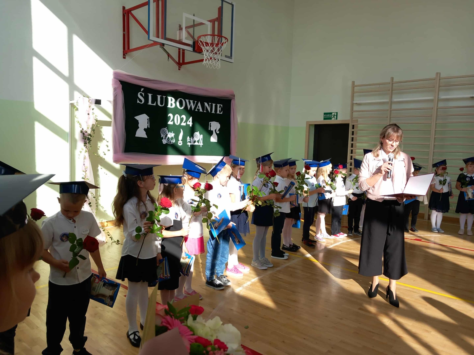 Uroczystość rozpoczęła się od powitania gości przez Panią Dyrektor - Annę Łysiak. Wśród zaproszonych osób znaleźli się rodzice, nauczyciele oraz uczniowie starszych klas dumnie prezentując sztandar szkoły. Następnie pierwszoklasiści zaprezentowali część artystyczną, którą przygotowali pod kierunkiem wychowawczyni Małgorzaty Warownej – Głąbickiej. Dzieci z dużym zaangażowaniem recytowały wiersze, śpiewały piosenki i pokazały, że są gotowe rozpocząć szkolną przygodę.