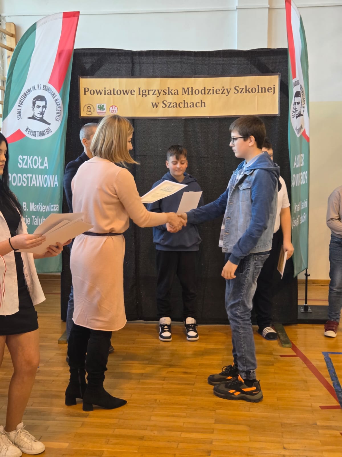W dniu 28 listopada, w Szkole Podstawowej w Rudzie Talubskiej, odbyły się II Powiatowe Igrzyska Młodzieży Szkolnej w Szachach, w których udział wzięło 40 uczniów szkół podstawowych, w tym 4 uczniów naszej szkoły. W kategorii chłopcy, klasy 4-6 naszym reprezentantem był uczeń klasy VI Dawid Szlendak, a w kategorii chłopcy, klasy 7-8 wystartowało dwóch uczniów klasy VII, Bartłomiej Łuczyn i Jakub Zduniak oraz uczeń klasy VIII Jacek Krawiec, który zajął zaszczytne 3 miejsce i zdobył medal, za co składamy mu serdeczne gratulacje.