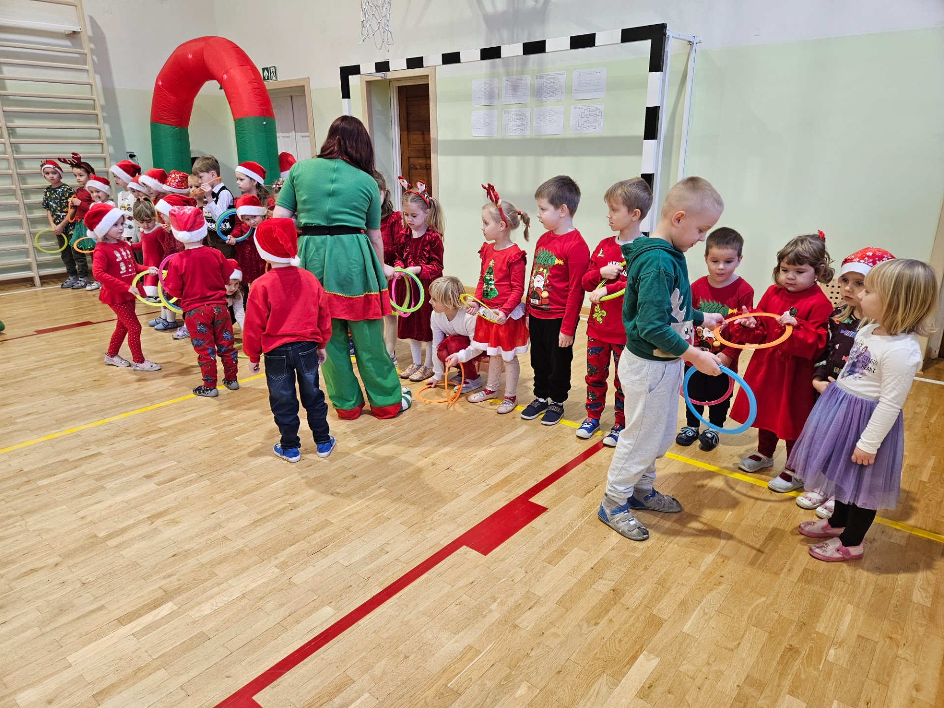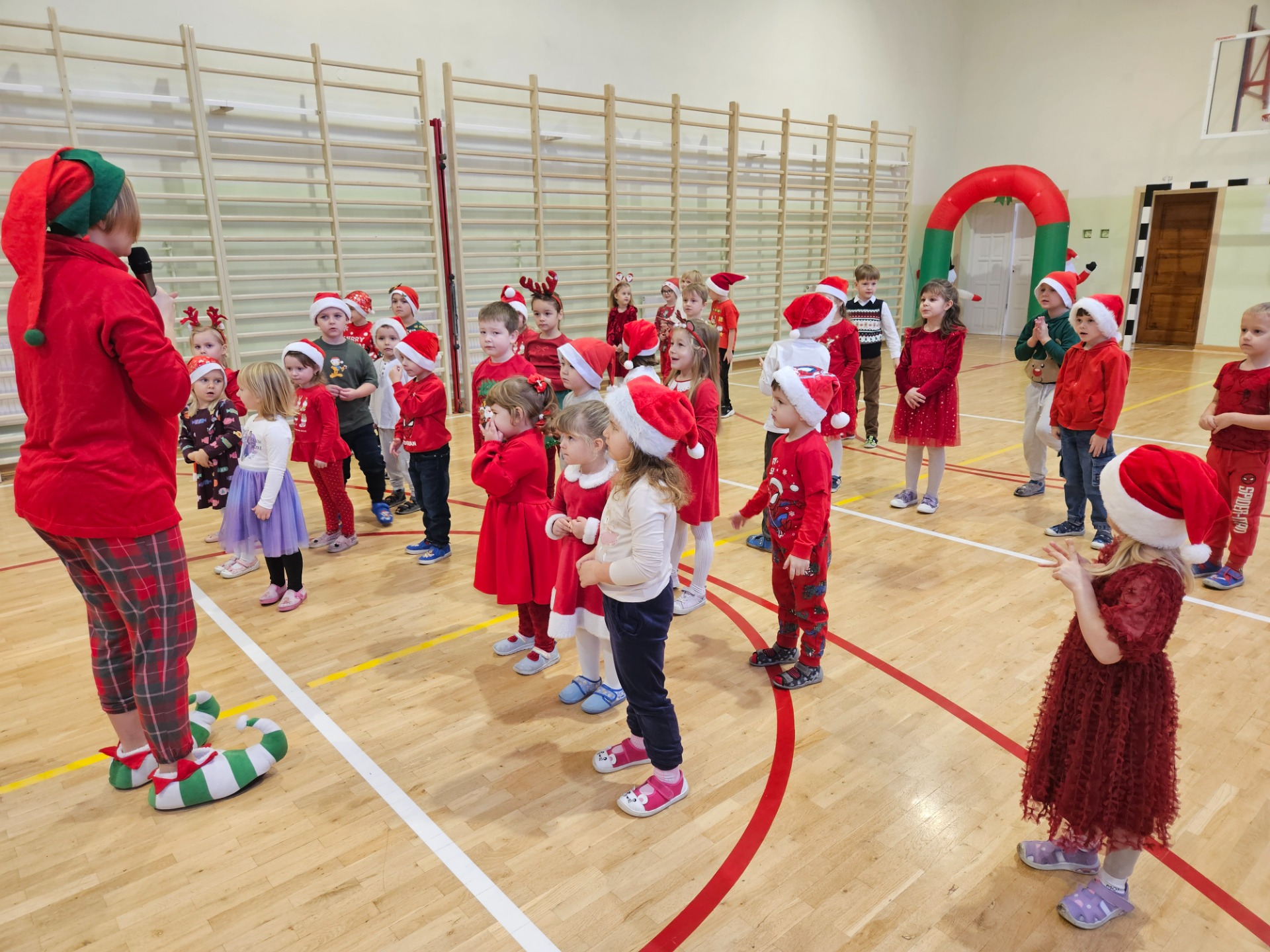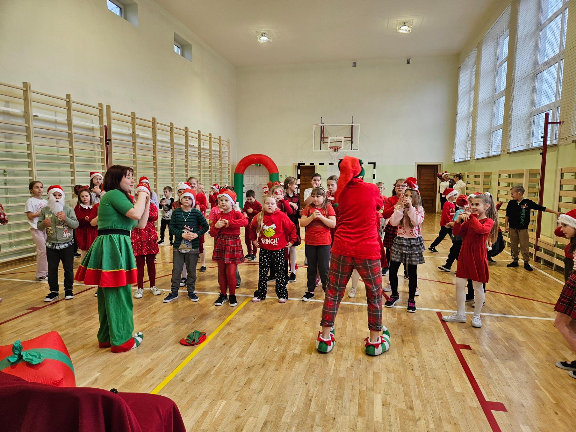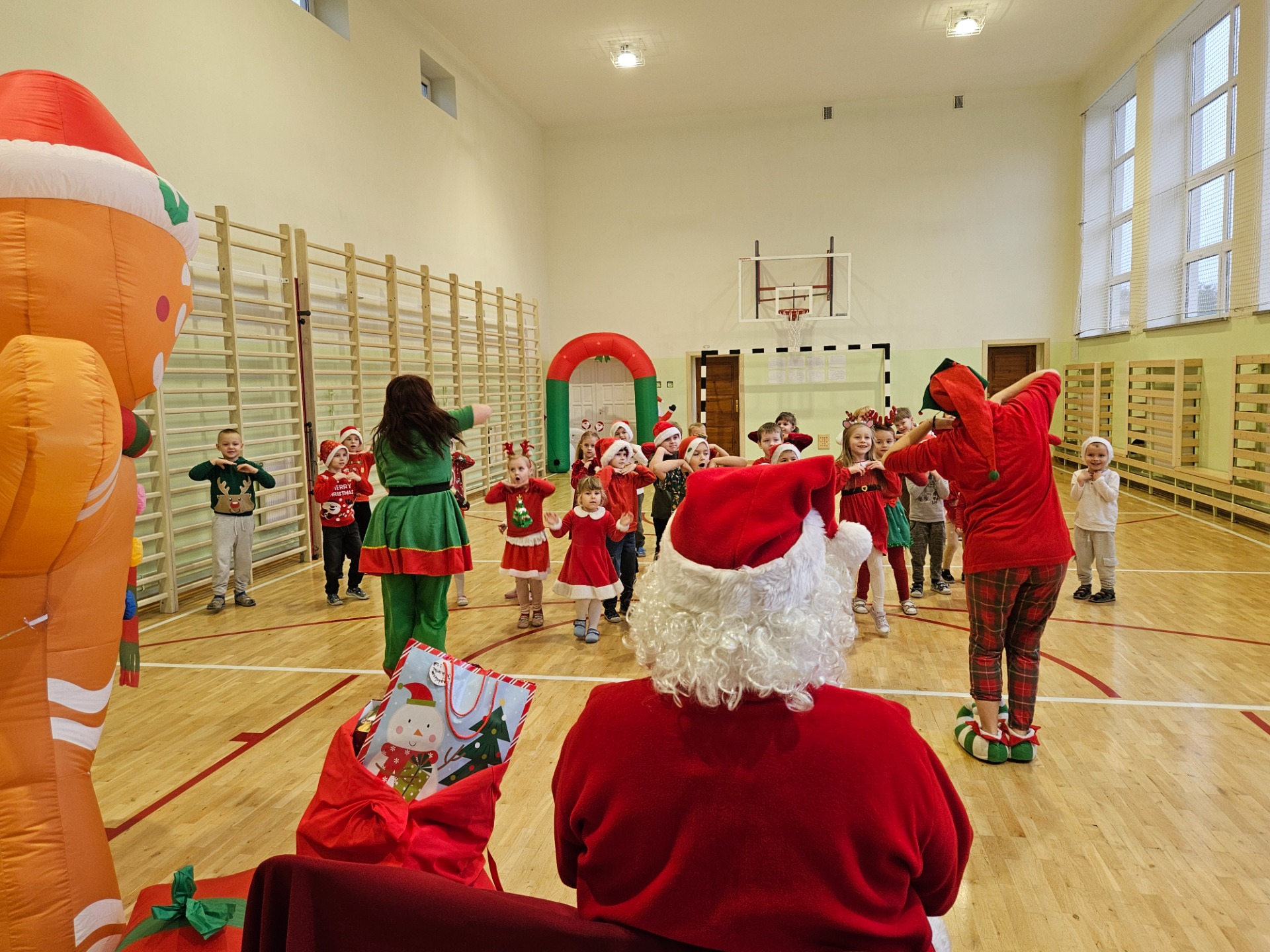 Najpierw grupy przedszkolne, a następnie uczniowie klas I–III wzięli udział w wyjątkowej zabawie przygotowanej przez wesołe elfy. Pięknie udekorowana sala gimnastyczna zamieniła się w krainę Świętego Mikołaja – pełną zimowych barw, światełek i uśmiechu. Dzieci brały udział w konkurencjach, tańcach i zabawach przy świątecznych piosenkach, a elfy dbały o to, aby każdy świetnie się bawił.