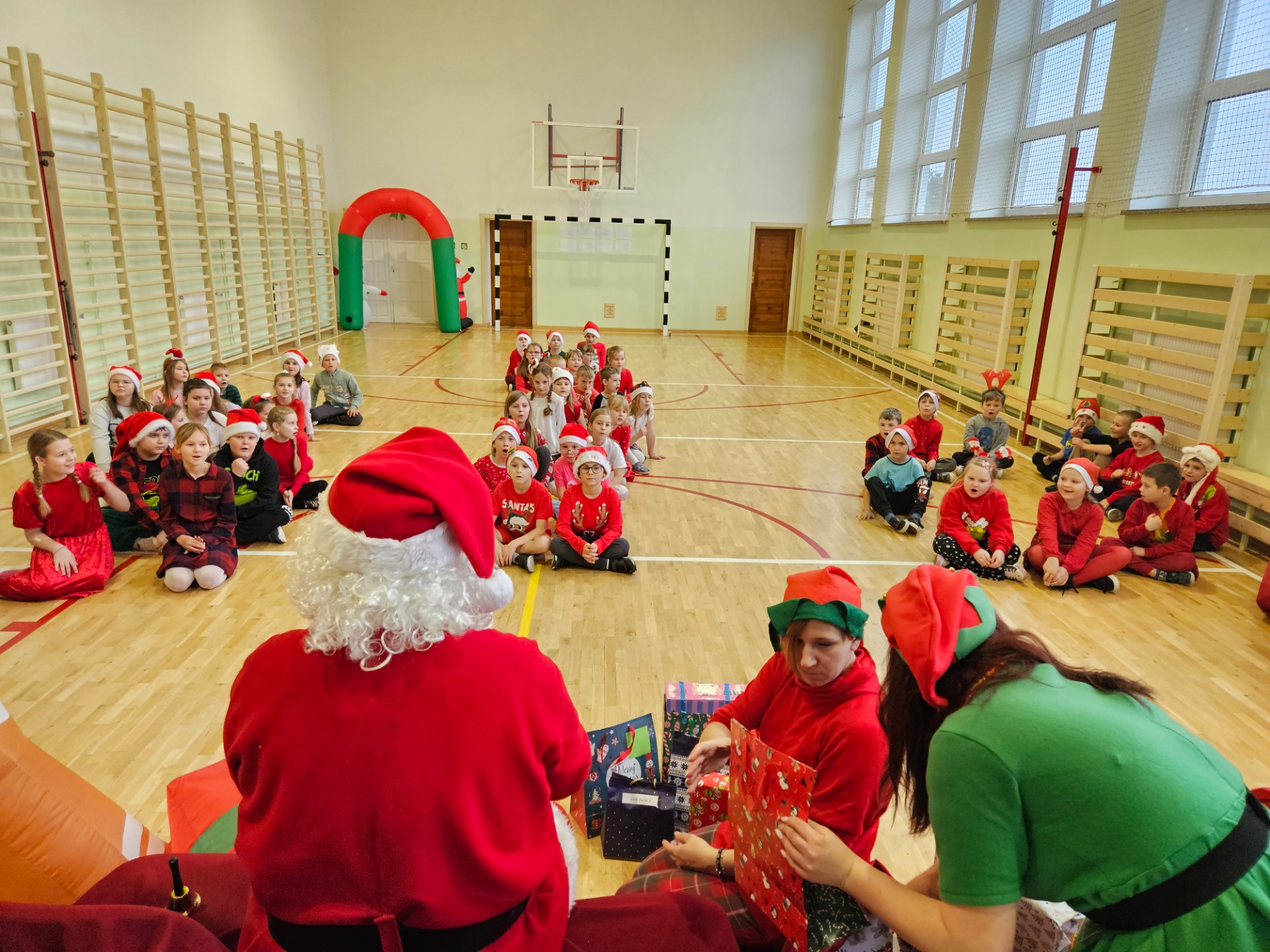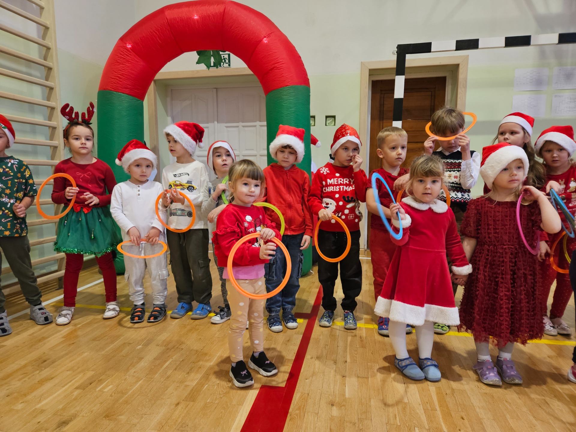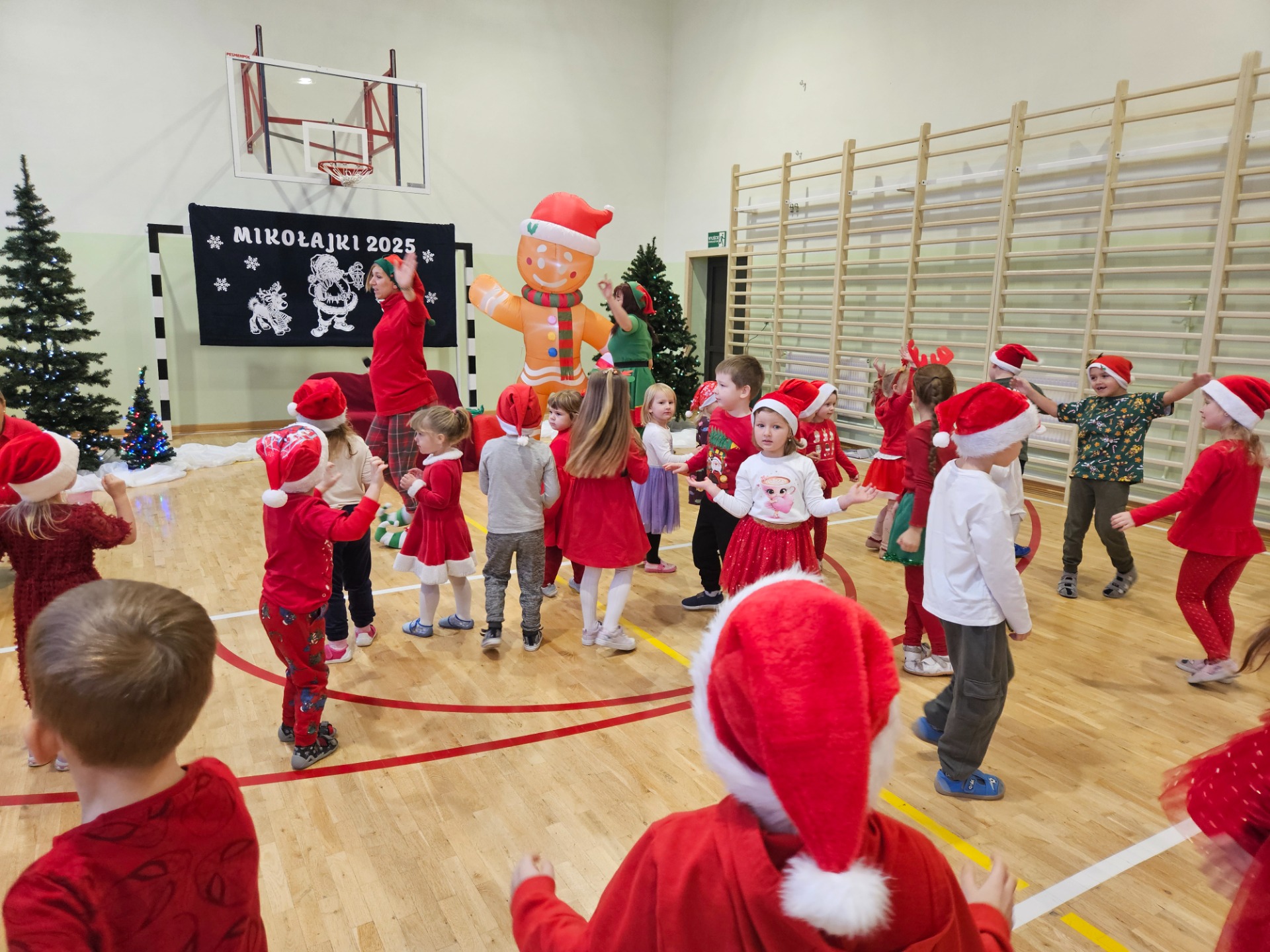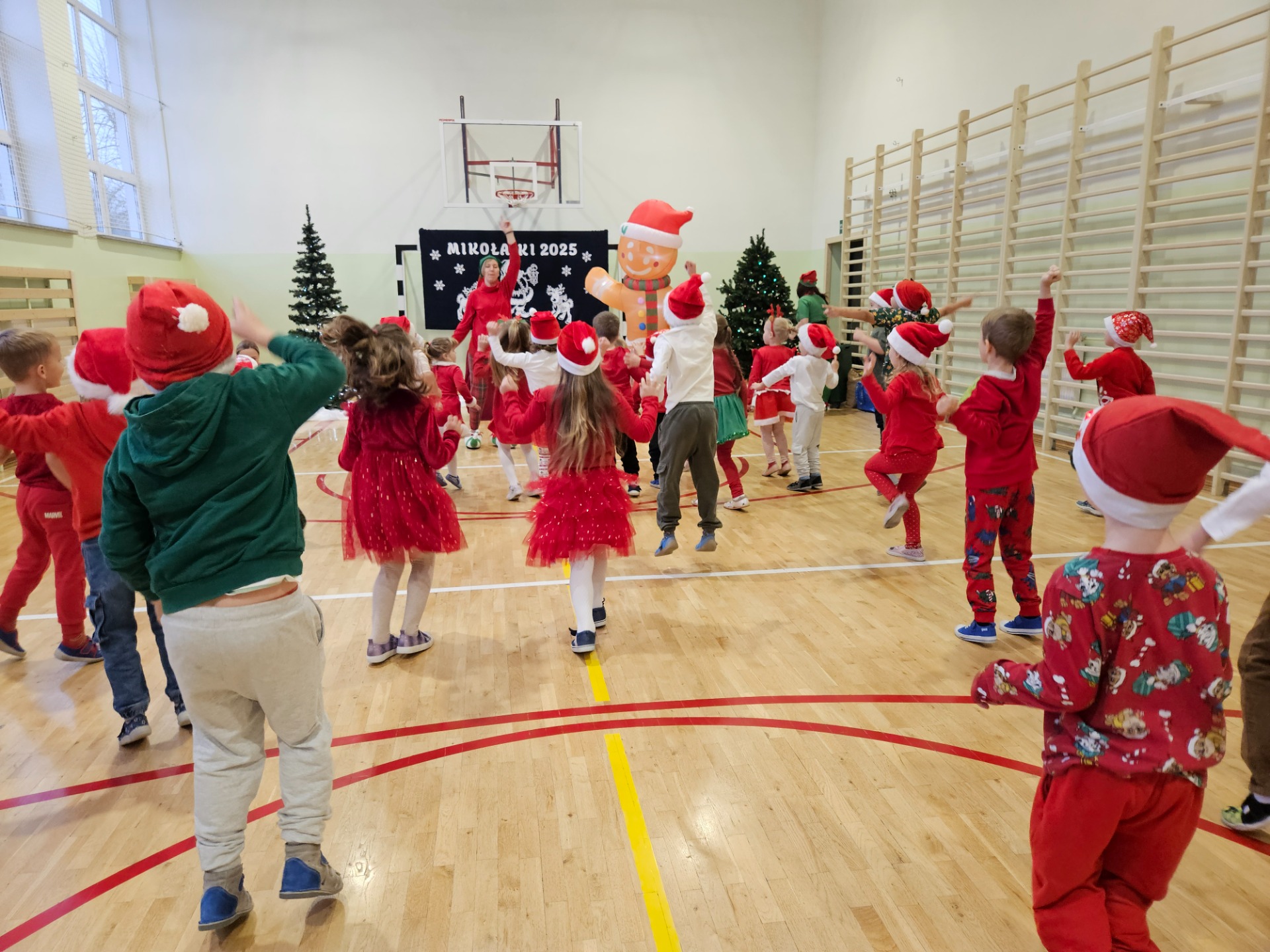 Najpierw grupy przedszkolne, a następnie uczniowie klas I–III wzięli udział w wyjątkowej zabawie przygotowanej przez wesołe elfy. Pięknie udekorowana sala gimnastyczna zamieniła się w krainę Świętego Mikołaja – pełną zimowych barw, światełek i uśmiechu. Dzieci brały udział w konkurencjach, tańcach i zabawach przy świątecznych piosenkach, a elfy dbały o to, aby każdy świetnie się bawił.