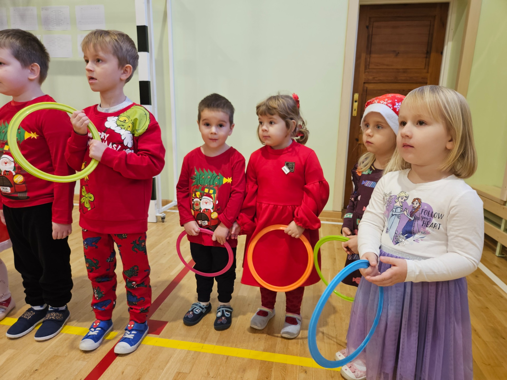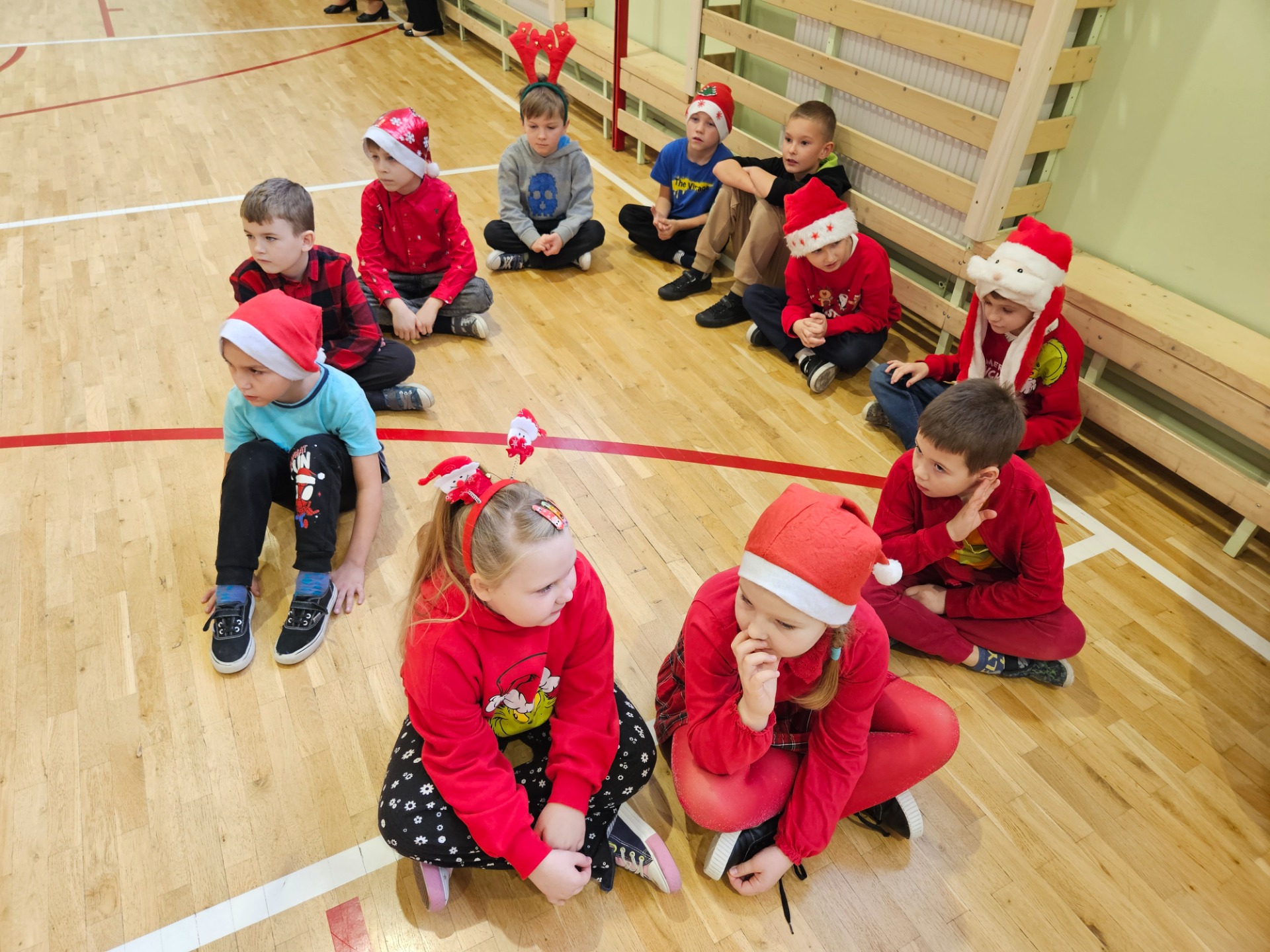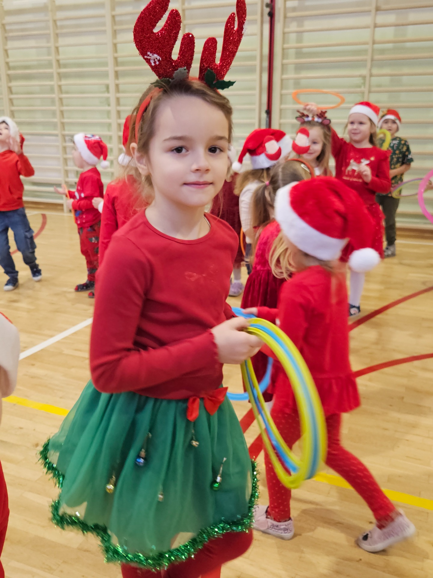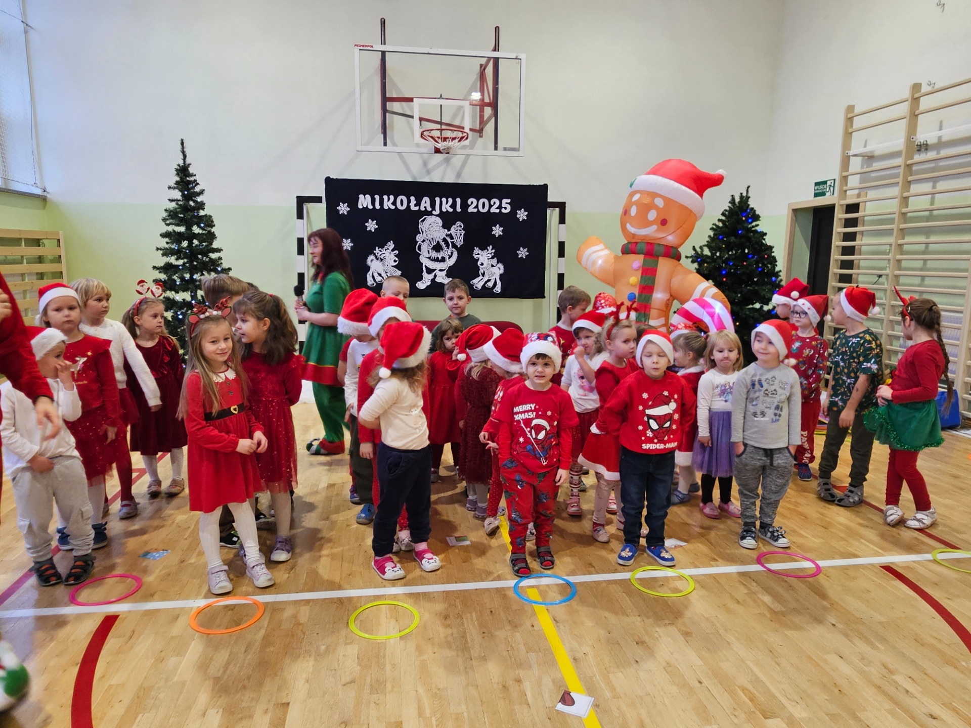 Najpierw grupy przedszkolne, a następnie uczniowie klas I–III wzięli udział w wyjątkowej zabawie przygotowanej przez wesołe elfy. Pięknie udekorowana sala gimnastyczna zamieniła się w krainę Świętego Mikołaja – pełną zimowych barw, światełek i uśmiechu. Dzieci brały udział w konkurencjach, tańcach i zabawach przy świątecznych piosenkach, a elfy dbały o to, aby każdy świetnie się bawił.
