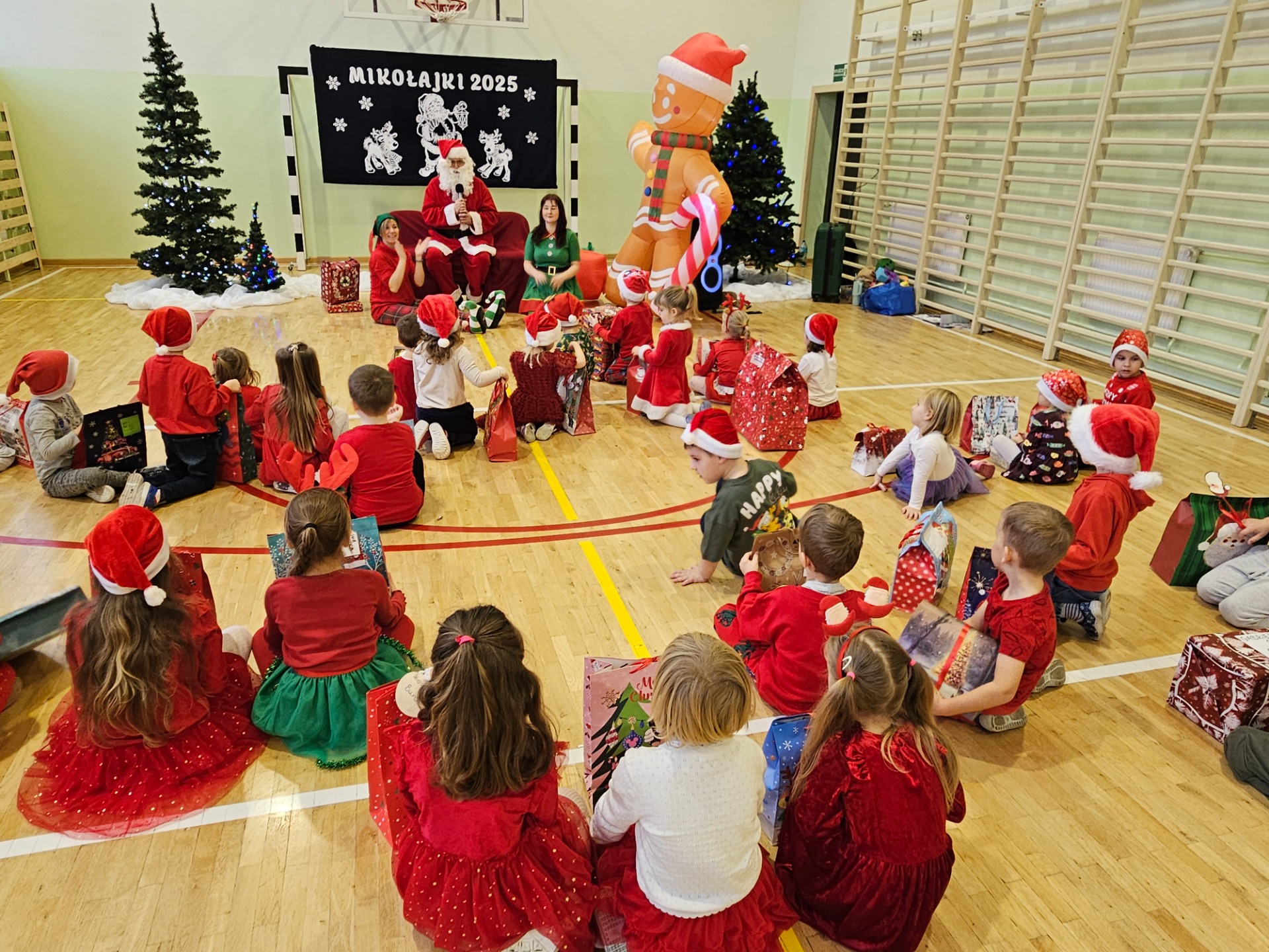 Nagle rozległ się dźwięk dzwoneczków… i do sali wkroczył Święty Mikołaj z wielkimi workami prezentów! Każde dziecko zostało wyczytane, mogło usiąść Mikołajowi na kolanach, odebrać prezent i zrobić pamiątkowe zdjęcie. Radości i szerokich uśmiechów nie było końca – w końcu spotkanie z Mikołajem to coś, na co wszyscy czekają przez cały rok.