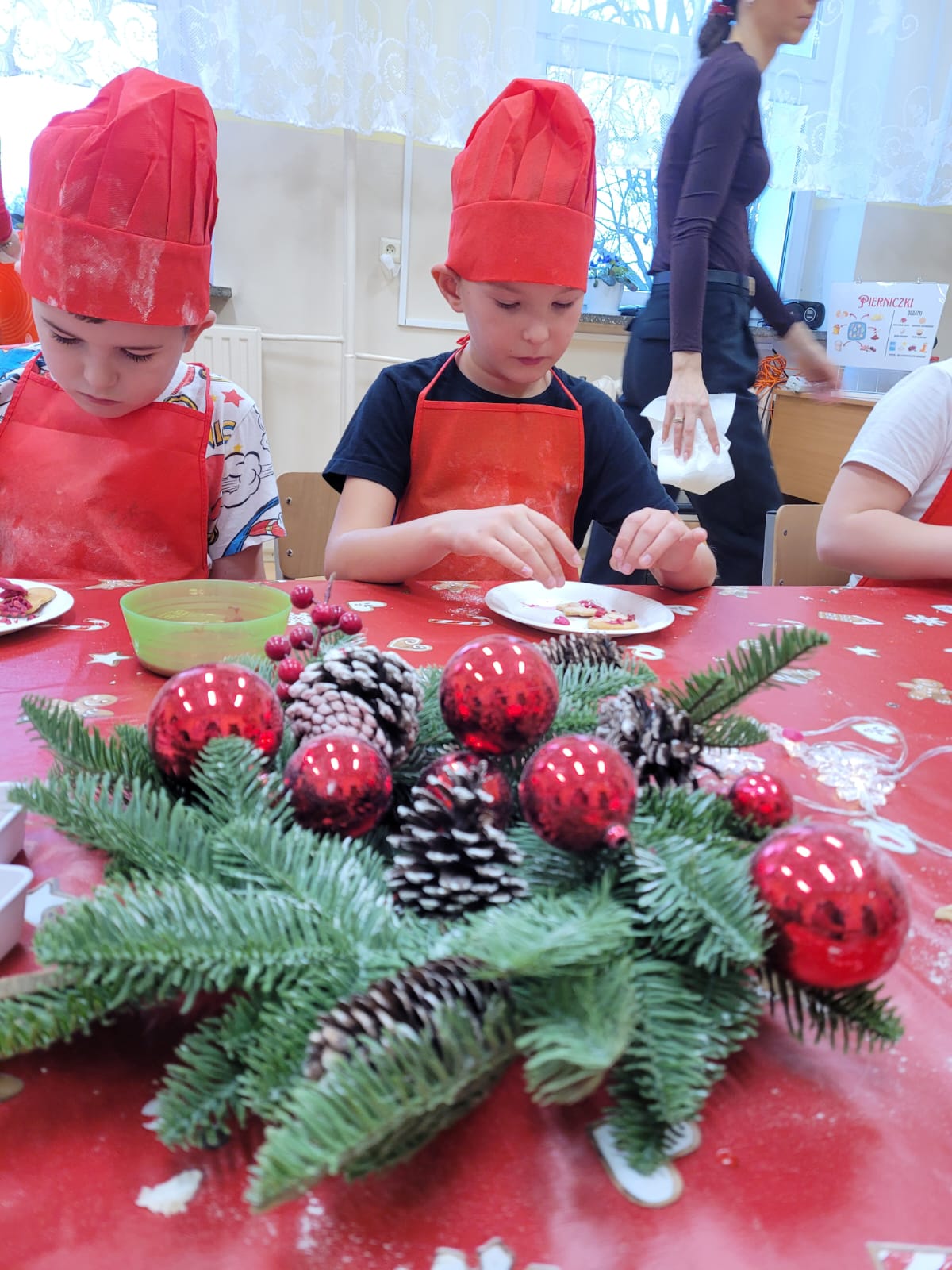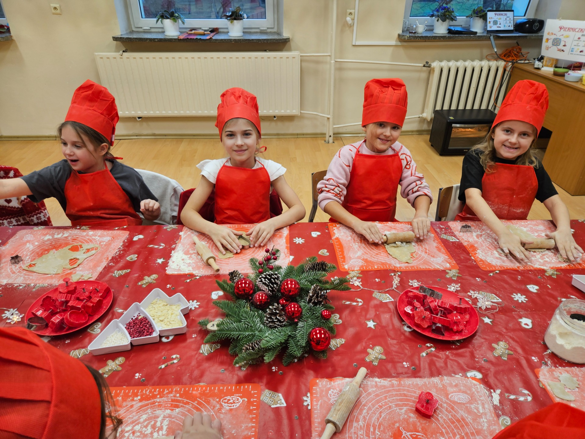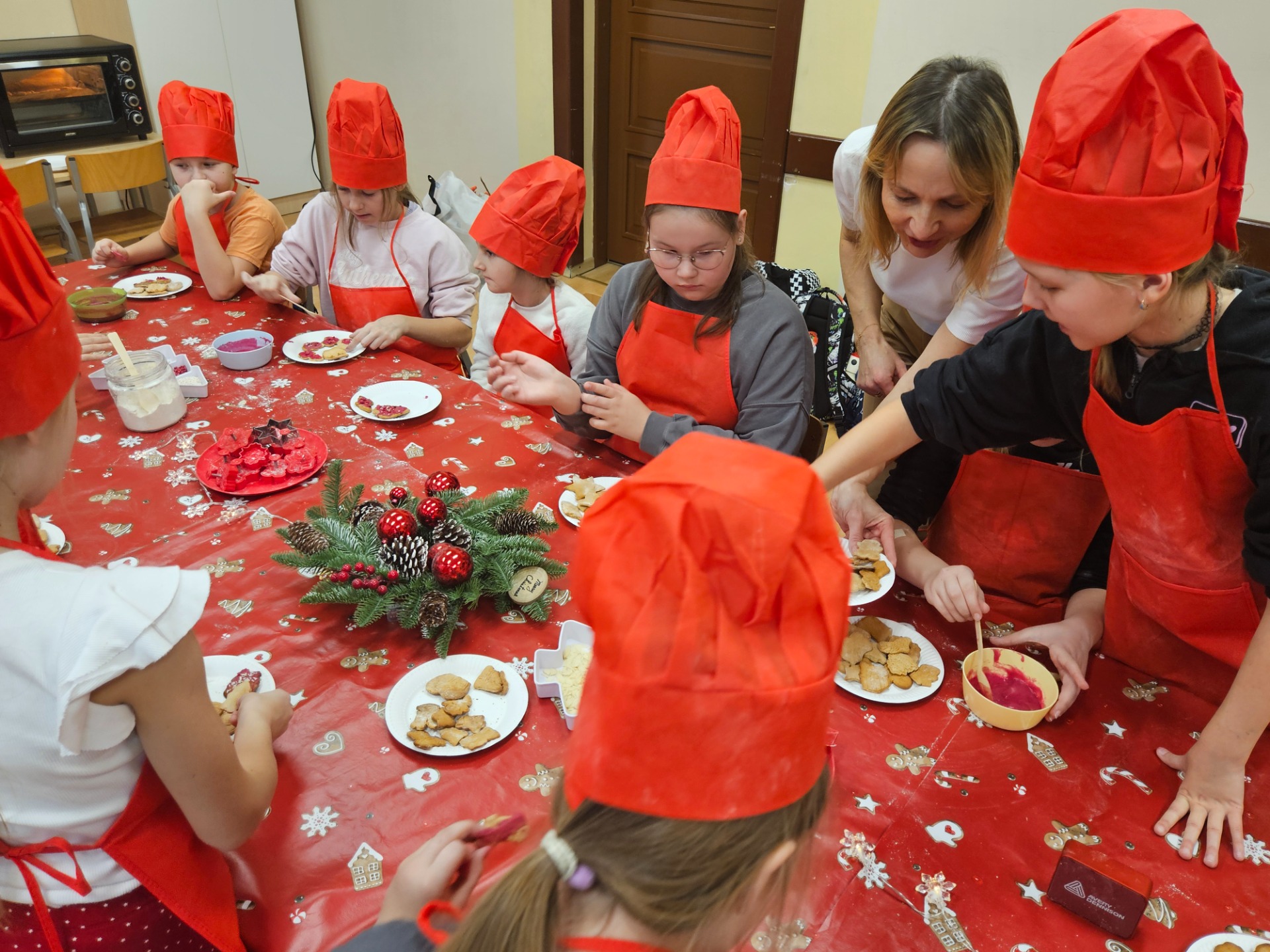W drugiej, kulinarnej części warsztatów, przy pięknie nakrytym i udekorowanym stole dzieci wcieliły się w rolę prawdziwych kucharzy, zakładając czerwone czapki i fartuszki. Najwięcej radości sprawiło pieczenie i ozdabianie pierniczków - tym razem w zdrowszej wersji, bez dodatku cukru, za to z aromatycznymi, naturalnymi dodatkami. Dzieci mogły wykazać się kreatywnością tworząc wyjątkowe, aromatyczne wypieki. W tle słychać było świąteczną muzykę i rozmowy dzieci. W taki sposób powstały piękne choinki, mikołaje, serca, gwiazdki. Wykonane dzieła dzieci zabrały do domu, aby podzielić się z najbliższymi.