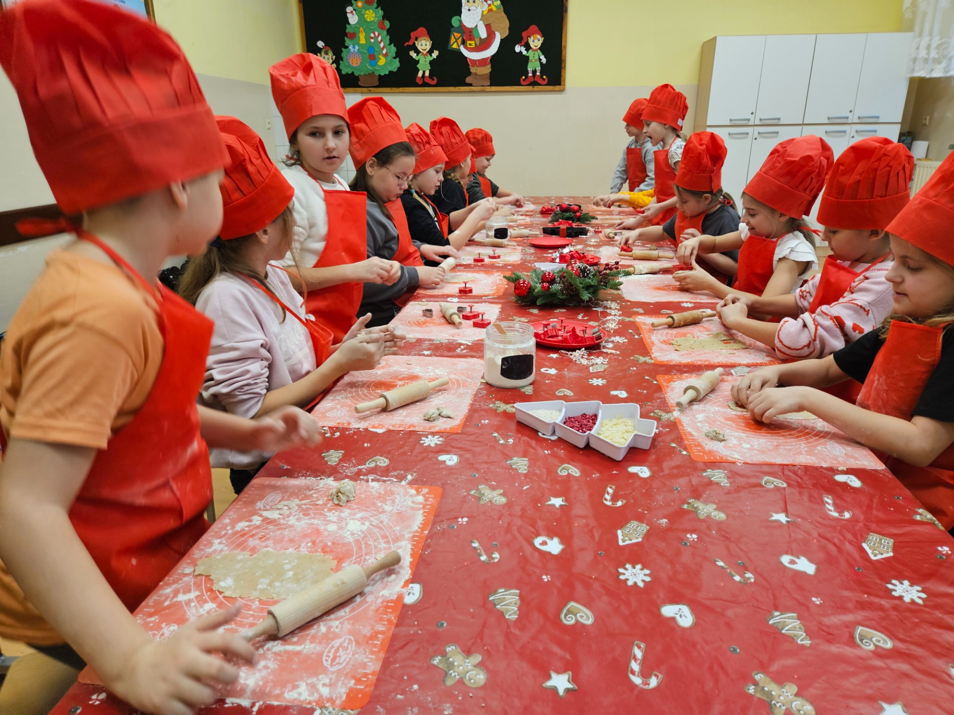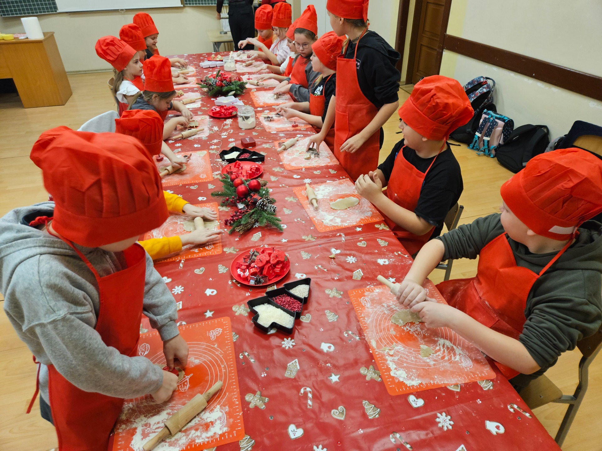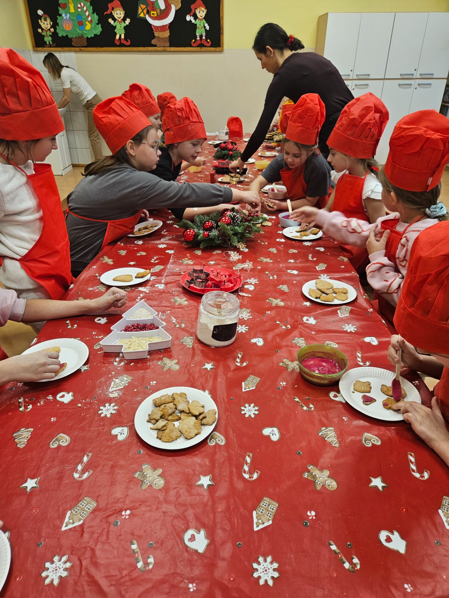 W drugiej, kulinarnej części warsztatów, przy pięknie nakrytym i udekorowanym stole dzieci wcieliły się w rolę prawdziwych kucharzy, zakładając czerwone czapki i fartuszki. Najwięcej radości sprawiło pieczenie i ozdabianie pierniczków - tym razem w zdrowszej wersji, bez dodatku cukru, za to z aromatycznymi, naturalnymi dodatkami. Dzieci mogły wykazać się kreatywnością tworząc wyjątkowe, aromatyczne wypieki. W tle słychać było świąteczną muzykę i rozmowy dzieci. W taki sposób powstały piękne choinki, mikołaje, serca, gwiazdki. Wykonane dzieła dzieci zabrały do domu, aby podzielić się z najbliższymi.