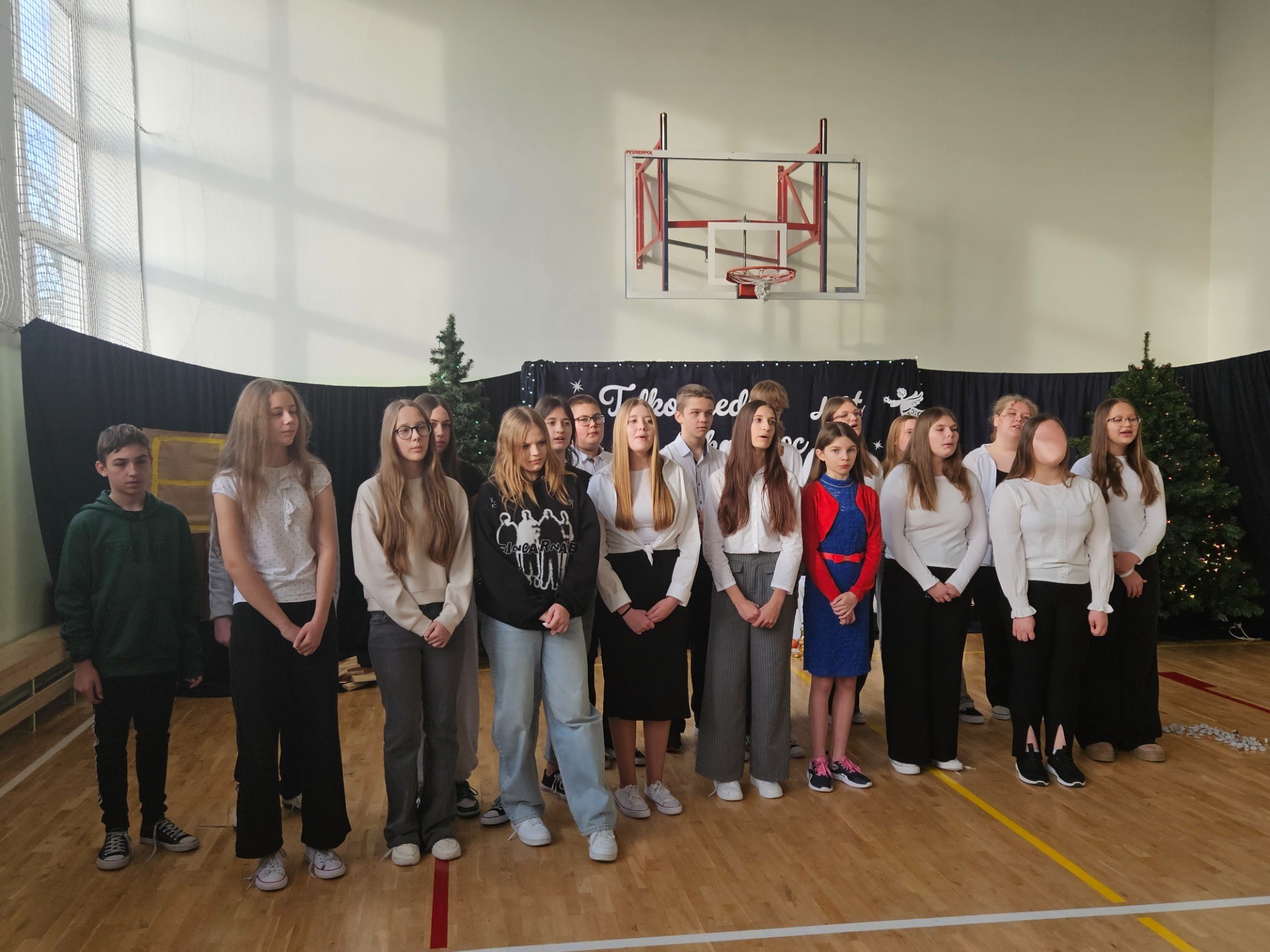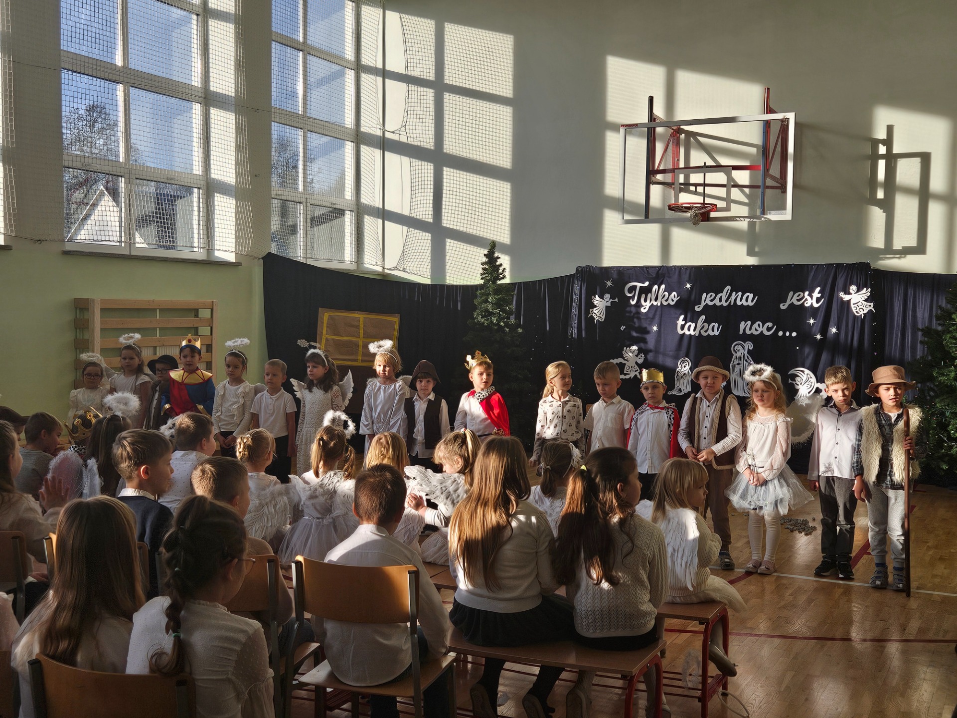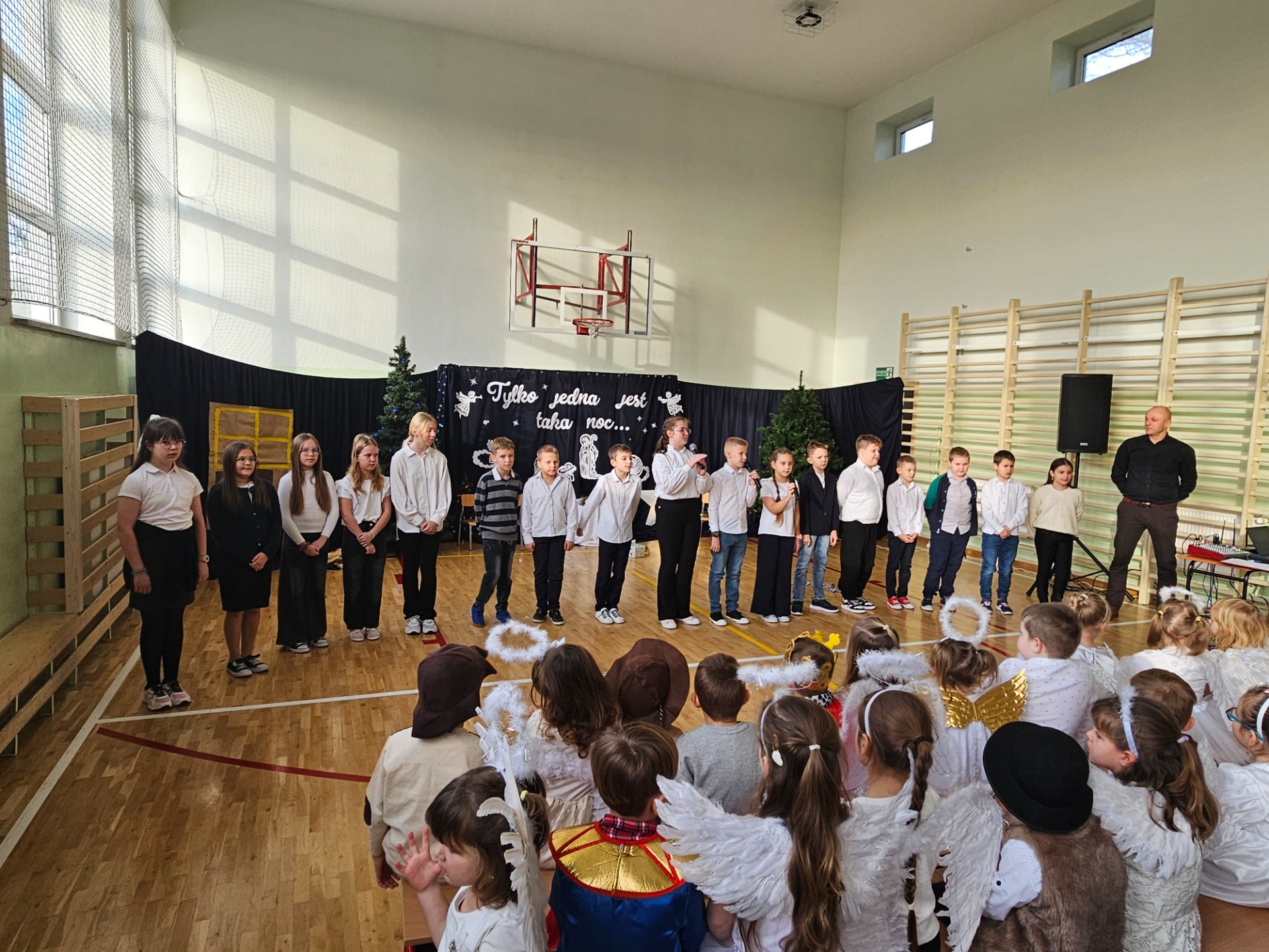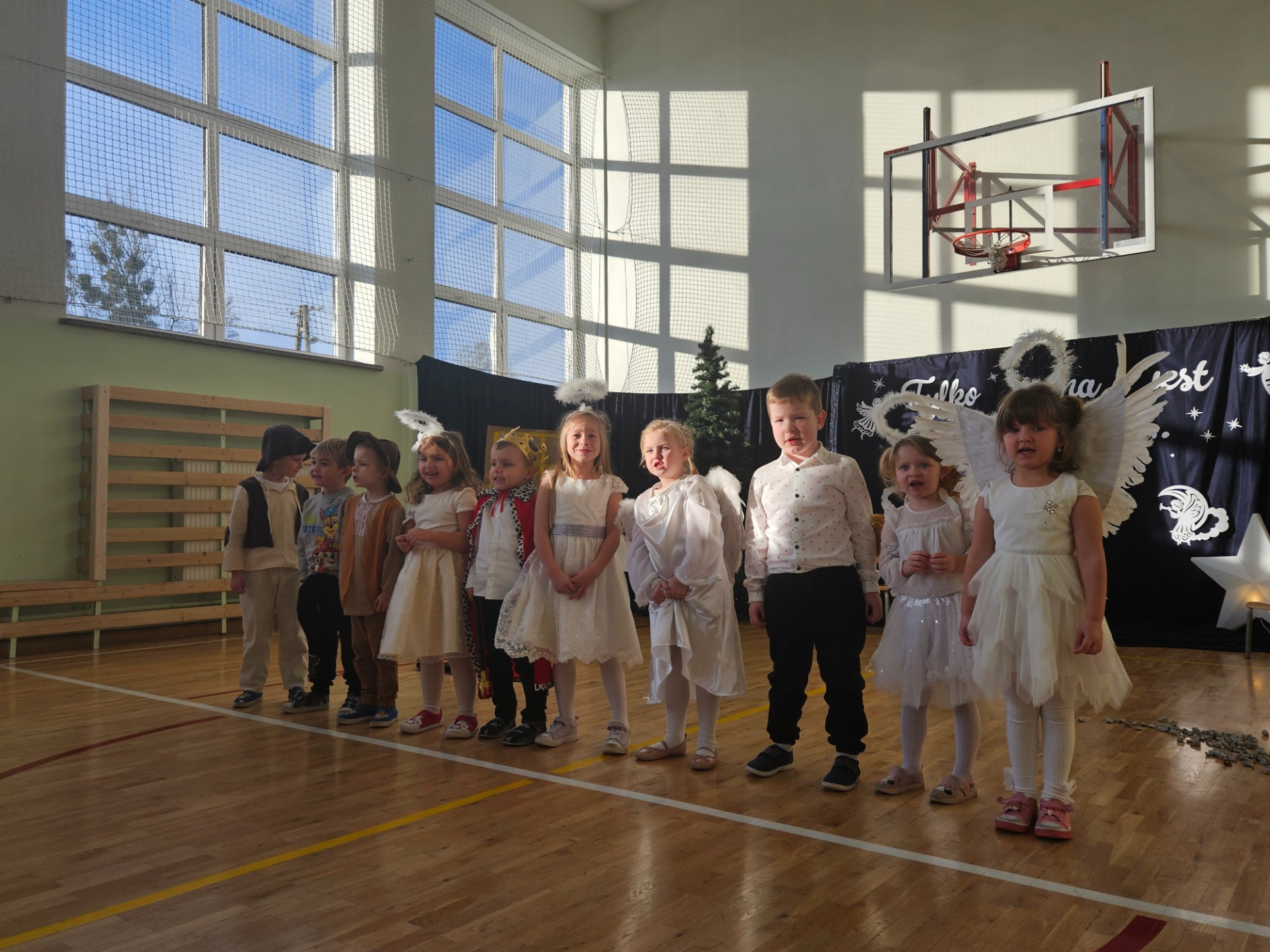 Po części artystycznej nastąpiło wspólne kolędowanie, w którym udział wzięły wszystkie klasy oraz grupy przedszkolne. Swoje występy zaprezentowały dzieci od najmłodszych – grupy 3-latków, aż po uczniów klasy VIII. Każda grupa przygotowała kolędy i pastorałki, które zachwyciły zgromadzoną publiczność swoją różnorodnością, szczerością i świątecznym charakterem.