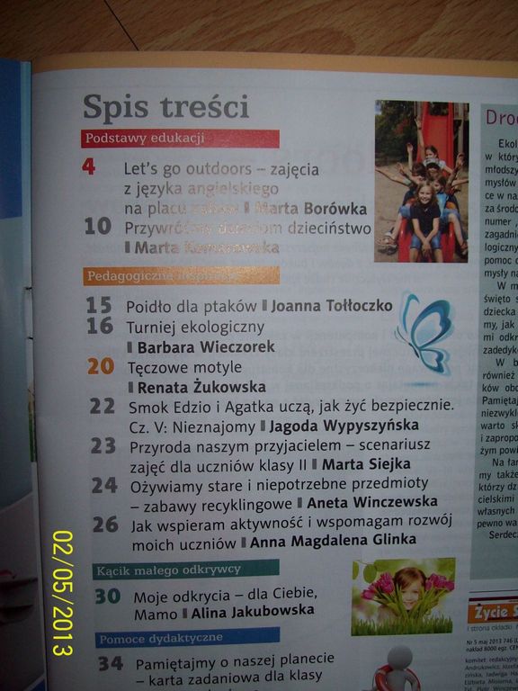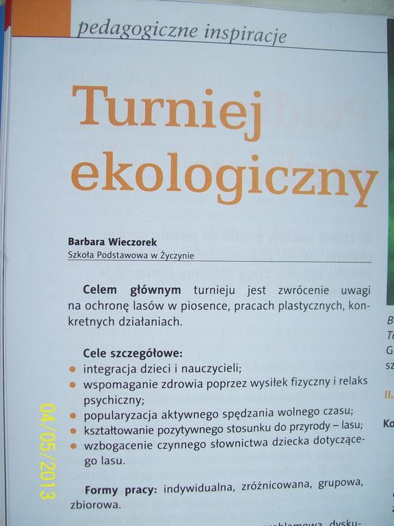 Redaktorzy czasopisma "Życie Szkoły" kolejny raz wyróżnili działania wychowawczyni i uczniów klasy trzeciej. Tym razem za sprawą udziału w turnieju ekologicznym, który został napisany na potrzeby uczniów nauczania zintegrowanego. Turniej został opublikowany w majowym wydaniu czasopisma, w dziale "pedagogiczne inspiracje". Zawiera on wiele ciekawych ćwiczeń, w których uczniowie z wielkim zaangażowaniem uczestniczyli. Do ćwiczeń wykorzystano naturalne okazy przyrodnicze: kasztany, żołędzie, szyszki, piórka, zasuszone listki i trawki. Ważnym etapem turnieju było złożenie przez uczniów ekologicznego przyrzeczenia.