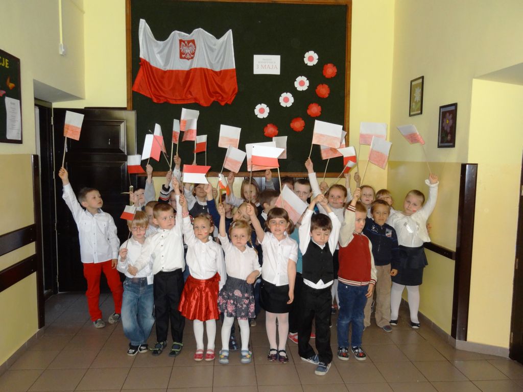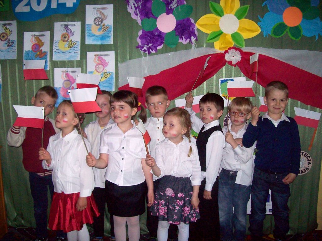 Przedszkolaki, które uczestniczyły w akademii, trzymały w rękach biało – czerwone chorągiewki, w ten sposób okazaały szacunek dla barw narodowych.